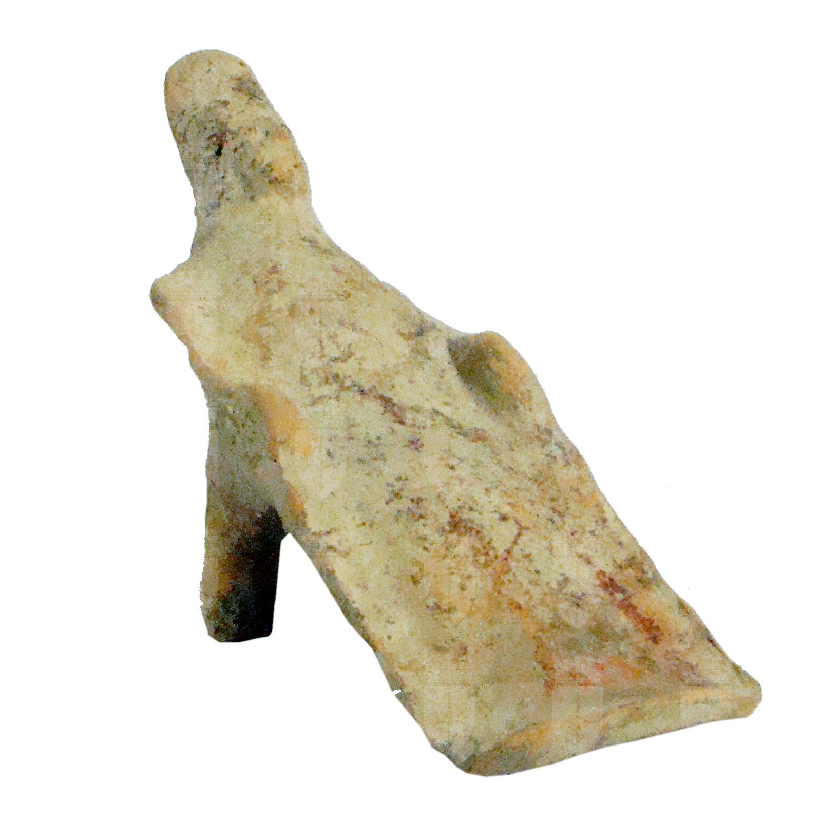 Figurina in terracotta, realizzata a matrice. Tracce di sovradipintura rossa. Etichetta sul retro con il numero "678". Reca, inoltre, la cifra "678" realizzata in rosso. Figurina femminile assisa su trono, con due piccoli piedistalli sul retro. Particolari irriconoscibili. Estremamente stilizzata. Alto copricapo, volto rozzamente delineato nei suoi caratteri fisiognomici, grandi occhi rotondi, bocca diritta.