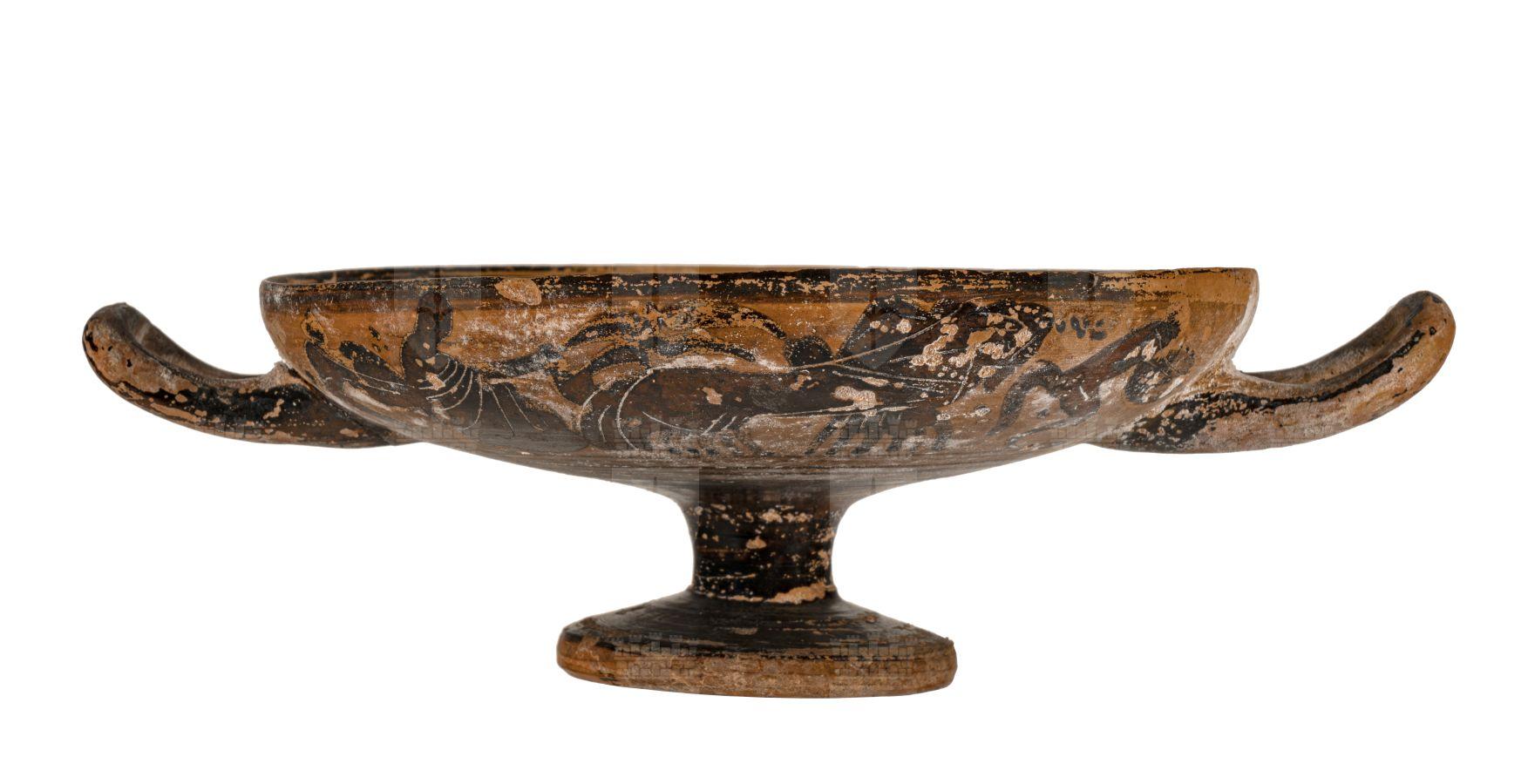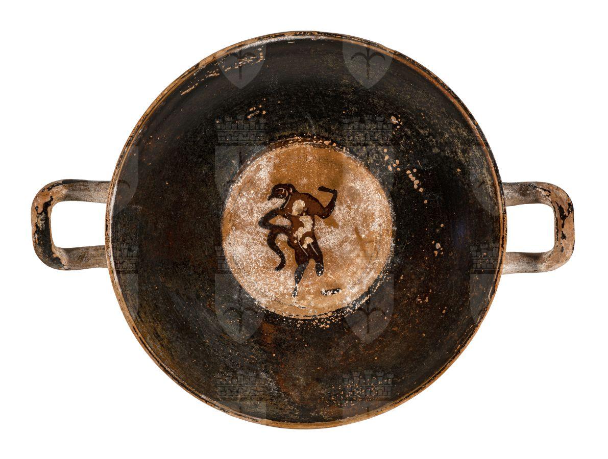 Kylix su basso stelo attica a figure nere. Su entrambi lati: un satiro stante che suona un timpano trattiene una donna a capo scoperto, Arianna, che sta per salire sul carro a due cavalli dei quali trattiene le redini; chiude la scena una analoga figura di satiro. All’interno, nel tondo centrale, una tipica figura di satiro danzante in posizione composta con la mano sinistra alzata.