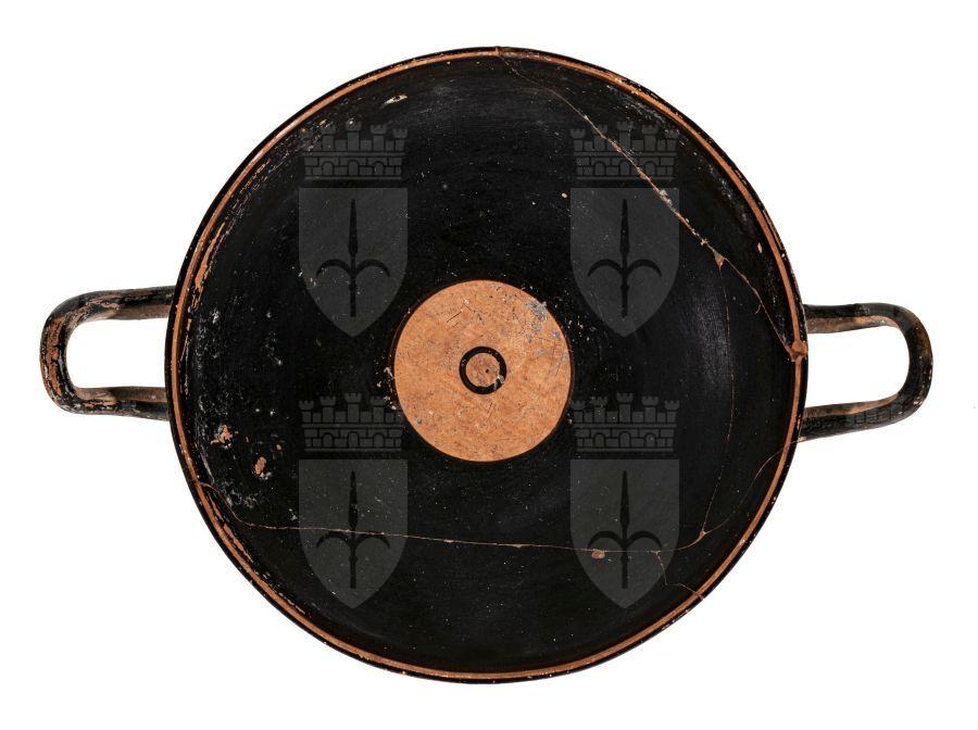 Kylix su basso piede attica a figure nere con tracce di colore rosse. Fascia di palmette.