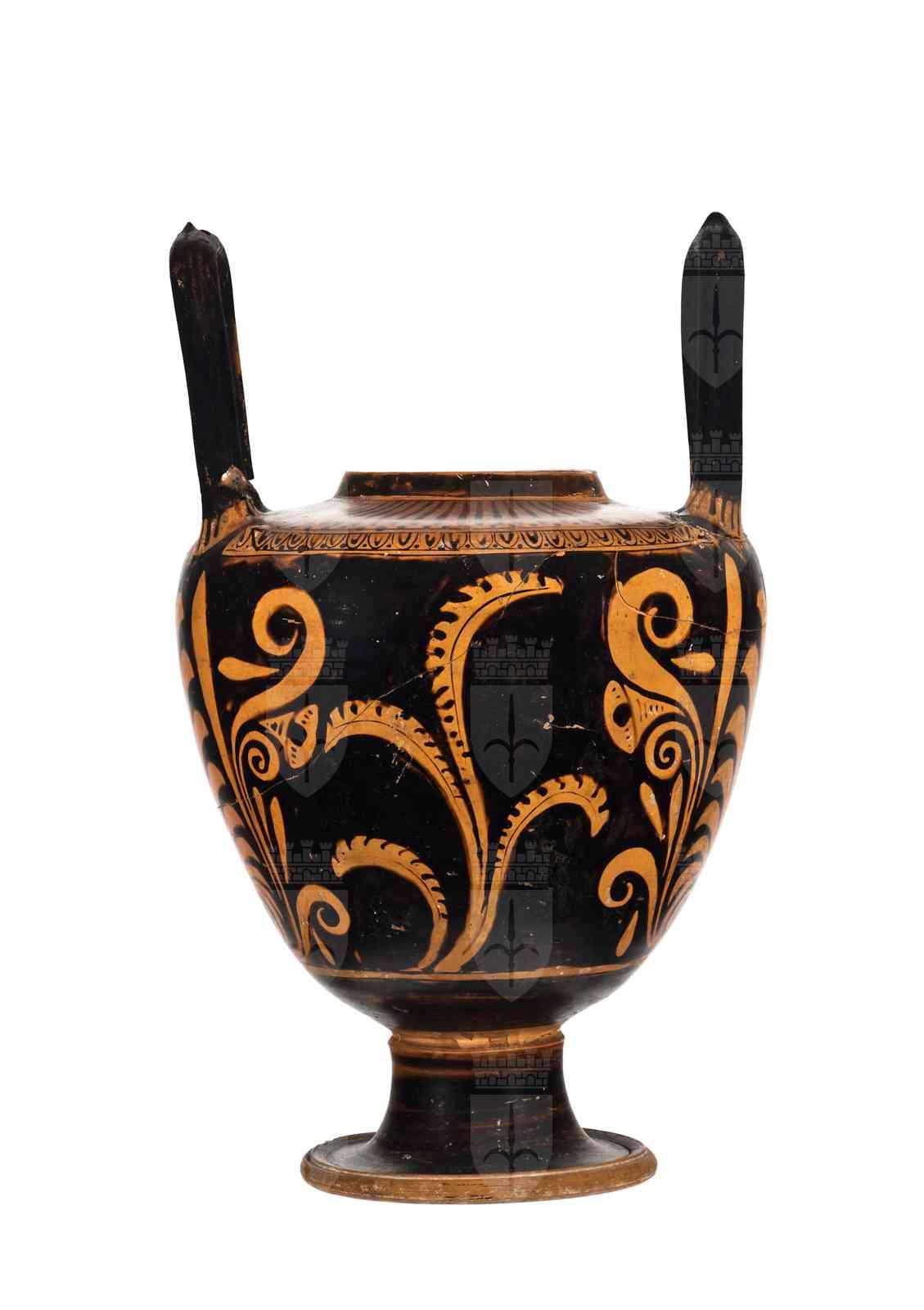 Argilla giallo rossastra (5 YR 6/6 Munsell); vernice lucente, di buona qualità, abbastanza ben conservata sebbene ci siano zone in cui appare diluita, il che ha causato problemi di cottura, specialmente poco al di sotto della spalla del lato A e presso il piede. Il vaso presenta un corpo ovoidale, con un'imboccatura non molto larga, su cui si imposta un breve labbro verticale, leggermente rastremato verso l'interno. Sulle spalle del vaso sono presenti, su entrambi i lati, due piccole protuberanze che sembrano quasi delimitare l'area sottostante, destinata alla decorazione figurata. Il vaso presenta poi una vasca profonda con fondo arrotondato che poggia su un piede a campana con stelo delimitato superiormente da una sottile modanatura, la quale si ripresenta anche sul bordo superiore dello spessore del piede. Il vaso presenta, impostate verticalmente sulla spalla, alte anse a bastoncello, sulla cui sommità sono presenti delle piccole protuberanze. Decorazione del lato A: al centro della scena è raffigurato un giovane stante e di profilo, che ha il baricentro spostato lateralmente, con il peso che poggia sulla sola gamba sinistra mentre la destra è leggermente piegata, a riposo. Ha i capelli corti ed è completamente avvolto da una veste caratterizzata dalla ricchezza dei drappeggi, che segnano le linee del corpo, e da un alto collo, la cui stoffa ricade sul petto. A sinistra è dipinto un ramoscello con nove foglie, forse di ulivo, e poco più in alto, all'altezza della testa del giovane, una palla a quattro spicchi. Decorazione del lato B: è raffigurato un elemento vegetale che occupa tutto lo spazio a disposizione. Le venature delle foglie sono rese per mezzo di spessi trattini neri, mentre il dorso delle foglie da linee molto sottili, che corrono per tutta la lunghezza dell'elemento vegetale. La decorazione accessoria è costituita, nello spazio sotto le anse, da girali fogliati e fioriti con campanule. Tra gli altri elementi decorativi vi è un sottile filetto risparmiato appena al di sotto del breve labbro verticale, che corre per tutta la circonferenza dell'imboccatura. A partire da questo comincia una fascia, che si estende per tutta la spalla in corrispondenza delle due scene figurate ed è decorata con baccellature, alternate a puntini lungo il bordo più esterno. Immediatamente sotto questa fascia, in corrispondenza del punto di passaggio dalla spalla al ventre, lungo la linea ideale che collega le due protuberanze, corre un fregio costituito dal ricorrere dalla sequenza ovulo-guscio-puntino. Sotto le scene figurate, lungo tutto la circonferenza del vaso, vi è una sottile fascia risparmiata. Un'ulteriore fascia risparmiata sottolinea, insieme ad una sottile modanatura, il punto di stacco tra ventre e piede, mentre il bordo superiore e lo spessore del piede sono interamente risparmiati. La base degli attacchi delle anse è decorata con una fascetta baccellata.