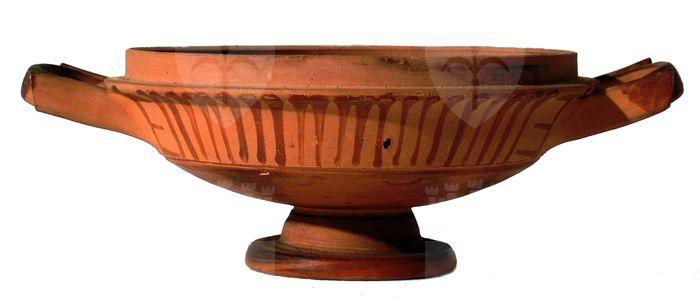 Lekanis a figure rosse con decorazione a fascia di linee verticali sulla coppa e due teste femminili con mitella tra palmette sul coperchio.