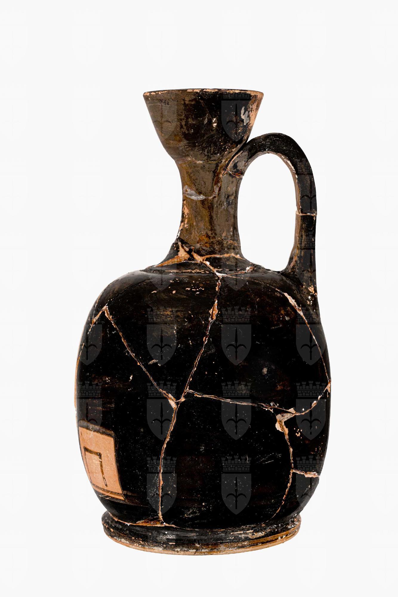 Lekythos attica a figure rosse con imboccatura troncoconica e corpo ovoidale. Donna stante con specchio. A destra, una pyxis chiusa, a sinistra un sedile a cuscino.