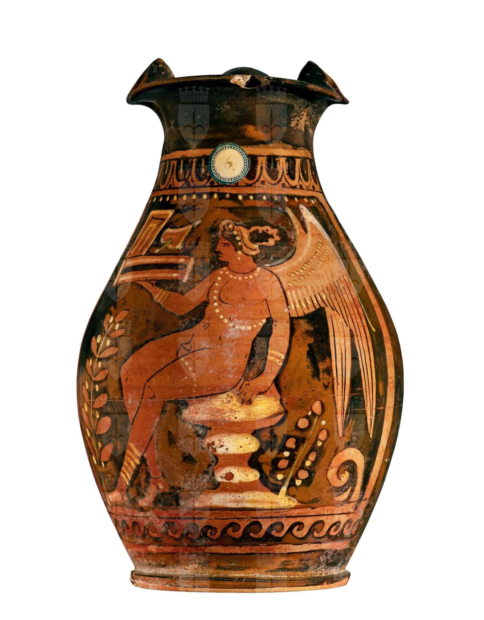 La Bellinato attribuisce l'oinochoe al Pittore di Menzies.
