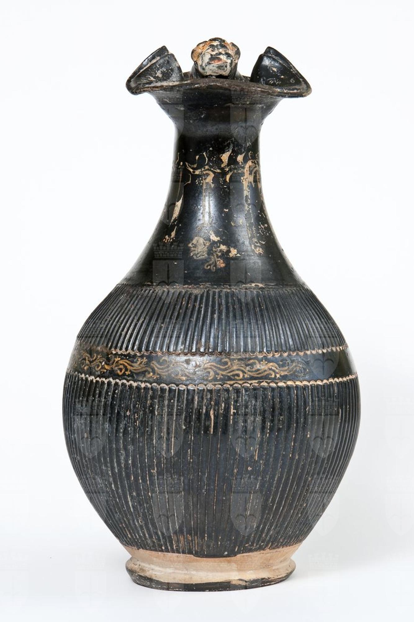 Oinochoe a vernice nera a tratti più chiara con sovraddipinture in bianco, giallo e rosso. labbro modanato, orlo estroflesso e trilobato, collo a profilo concavo, corpo globulare baccellato, con fascia liscia tra le baccellature, ansa a nastro verticale terminante in due protomi virili: una all’attacco superiore, che sembra raffigurare propriamente una maschera teatrale; una all’attacco inferiore, sembrerebbe un volto femminile, basso piede ad anello. Sul collo: tralcio d’edera con stelo sinuoso e rosette di punti in giallo, da cui pendono due bende frangiate disposte ad incorniciare una maschera centrale dal volto femminile, rivolto a sinistra. Dal tralcio di edera vanno, poi, a distaccarsi, alle estremità laterali, due rami secchi con foglie a trattini dipinti in giallo. Una linea dipinta in giallo va ad inquadrare superiormente il corpo baccellato. La fascia liscia tra le baccellature, evidenziata da due linee dipinte in giallo, è decorata da girali con fiori campanulati.