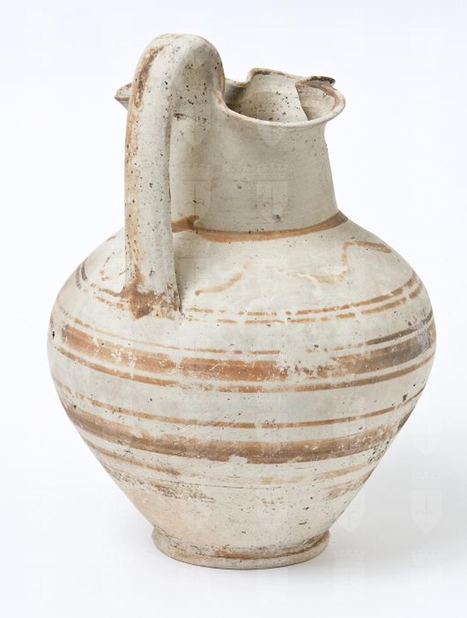 Oinochoe trilobata decorata a fasce si produzione peuceta. Collo corto, spalla carenata, corpo ovoidale, ansa a nastro sormontante impostata dalla bocca al di sotto della spalla, piede a disco. Decorazione monocroma in bruno: sul corpo, coppie di fasce sottili in bruno, orizzontali e parallele, tra cui si inserisce una fascia più larga marrone. Fascia sul collarino alla base del collo; coppia di grosse virgole in corrispondenza degli incavi del labbro che presenta l’orlo verniciato. Ansa e piede verniciati.