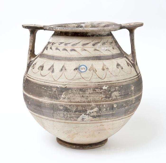 Olla in ceramica messapica con due anse verticali in forma di scalpello unite al labbro mediante rotella. Basso collo troncoconico a profilo convesso, corpo globoso, piede a disco. Decorazione monocroma in bruno su fondo di argilla naturale, su entrambi i lati: sul collo, riquadro con ramo di foglie lanceolate; sulla spalla, foglie lobate unite da archetti su un lato, serti con foglie d’edera sull’altro; sul ventre, fasce di colore bruno; sulle rotelle, giro di foglie uscenti dal centro di esse; sulle anse, due riquadri separati da doppie linee parallele, con serti d’edera; orlo e piede interamente dipinti.