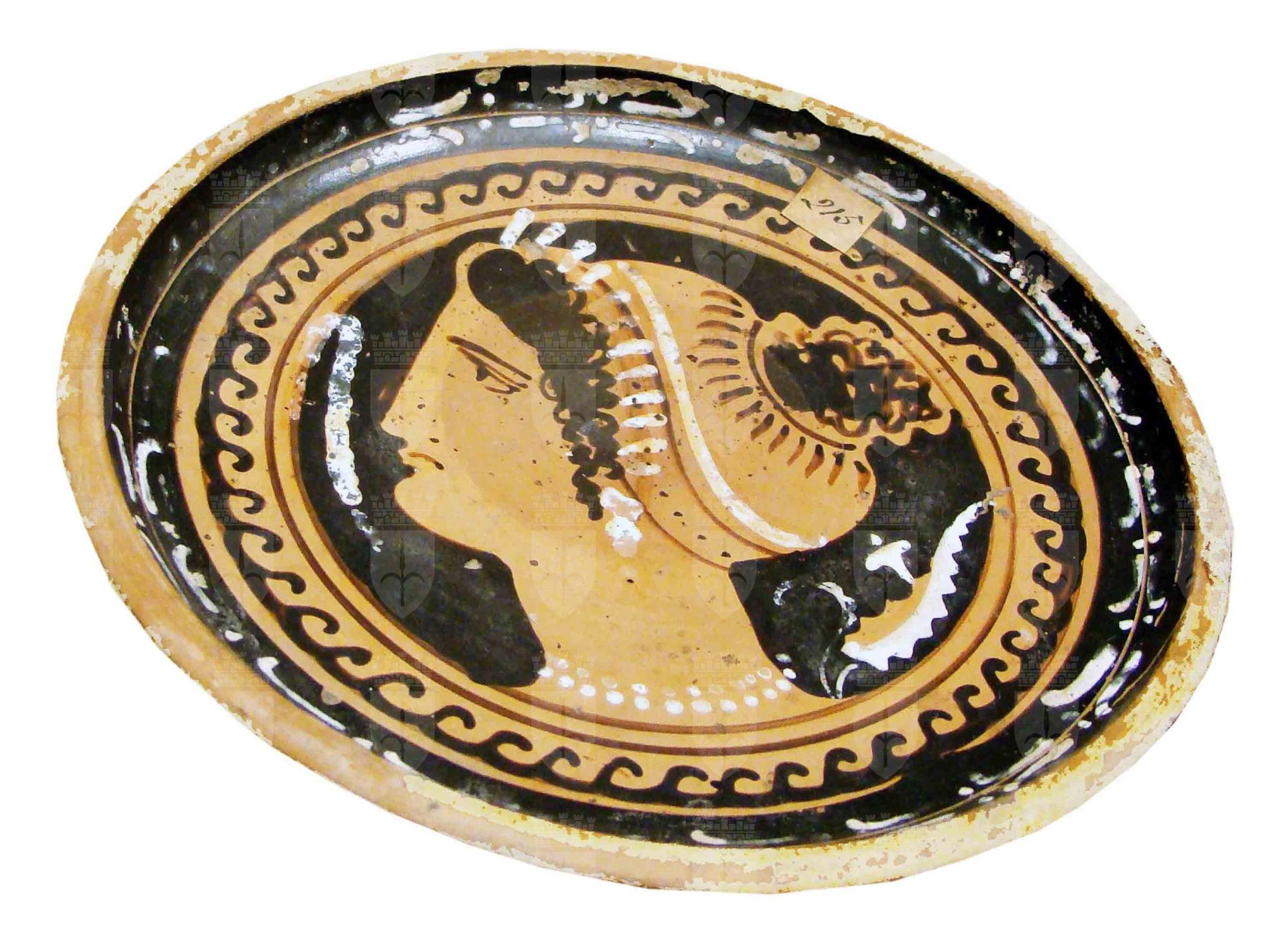 Piatto apulo a figure rosse con testa femminile con mitella entro fascia a onda marina corrente; elementi sovradipinti in bianco.
