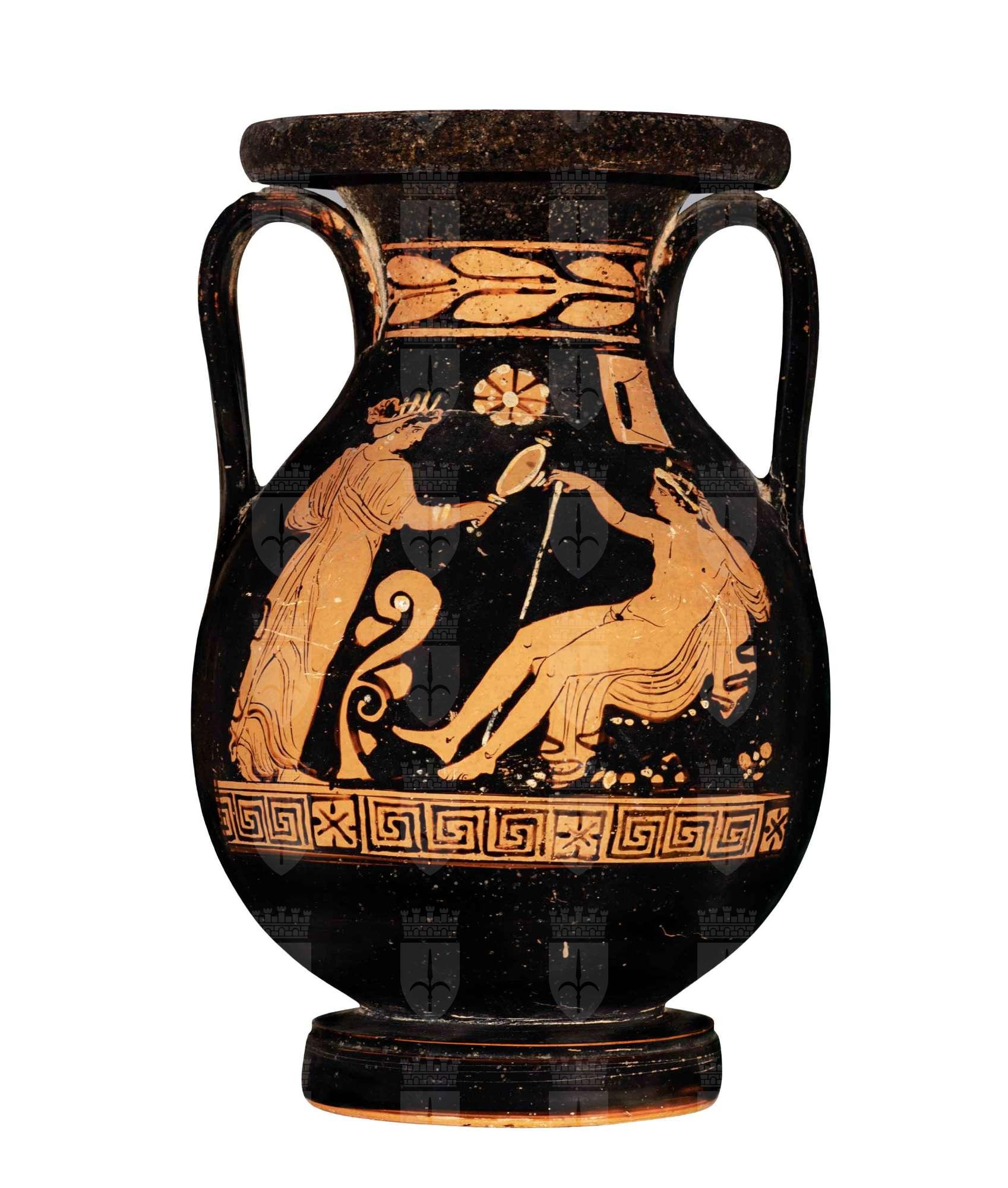 Pelike apula a figure rosse. Lato A: giovane nudo sdraiato con bastone, figura femminile stante con specchio, viticcio. Lato B: due giovani ammantati con bastone e pilastrino.