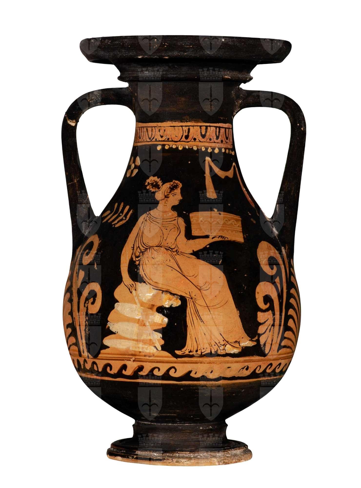 Orlo revoluto a profilo convesso con labbro estroflesso su base modanata con profilo angolato; spalla leggermente obliqua. Al di sotto delle scene figurate, entro fascia risparmiata corrente per tutta la circonferenza del vaso, decorazione a onde correnti destrorse campite a vernice nera. Anse e interno verniciato. Lato A: figura femminile seduta su roccia con tirso e cista Figura femminile di tre quarti con testa di profilo rivolta verso destra seduta su sedile roccioso sovradipinto in bianco; indossa un lungo chitone smanicato, ripreso in vita e decorato lungo l’orlo inferiore da una fila di puntini in corrispondenza delle pieghe del tessuto; le linee della gamba d. rimangono visibili attraverso la veste, mentre della s. si percepiscono solo i volumi al di sotto del chitone. I capelli sono raccolti in una mitra, che lascia fuoriuscire ricce ciocche su nuca e fronte. Arricchiscono la figura orecchini pendenti, due bracciali sovradipinti e una collana con filo in vernice nera e vaghi pendenti sovradipinti in bianco. I piedi sembrano calzati, per la presenza di sovraddipinture in bianco e giallo. Il braccio sinistro., flesso, regge cesta con coperchio, con sovraddipinture in bianco o giallo ormai evanide: i bordi superiore e inferiore evidenziati da una linea continua; la decorazione è costruita su due registri suddivisi da una doppia linea continua centrale; la decorazione del registro superiore è costituita a una serie di onde correnti; quella inferiore da una linea continua ondulata. La mano destra, posata sulla seduta, stringe tra le dita il bastone del tirso, che si appoggia anche al gomito. Il coronamento del tirso è costituito da 4 coppie di foglie e una foglia singola al vertice superiore. Nel campo in alto, subito al di sotto della fascia risparmiata con decorazioni ovulo-guscio-punto, fila di palline sovradipinte, che partono in corrispondenza della testa della figura femminile fino all’ansa d. Poco sotto, sulla s., rosetta quadripetala con profili e bottone centrale sovradipinto; a destra benda appesa con sovraddipinture in bianco (ormai del tutto evanide). Lato B: testa femminile con stephanè Testa femminile di profilo rivolta verso sinistra Fronte e naso costituiti da un’unica linea continua appena bombata all’attacco tra fronte e naso; occhio con dettaglio di palpebra superiore e inferiore non chiusi, rima superiore, pupilla e sopracciglio ben definiti. Breve tratto segna inferiormente la narice. Probabili sbaffi di vernice su mento e tra zigomo e collo della figura. I capelli sono raccolti in una mitra, bordato alle estremità da una doppia linea in vernice diluita, cui è sovrapposta una stephanè ad alti raggi in giallo sovradipinto indossa collana con filo continuo a vernice nera da cui pende una serie di vaghi circolari sovradipinti in bianco . Nel campo, in alto, tre elementi isolati: una rosetta a sei petali con profili e bottone centrale sovradipinti in bianco, un grappolo d’uva risparmiato con acini circolari in bianco sovradipinto e una finestra strombata profilata in bianco. Poco sotto, sulla destra., ulteriore rosetta a otto petali profilati e bottone centrale sovradipinto.