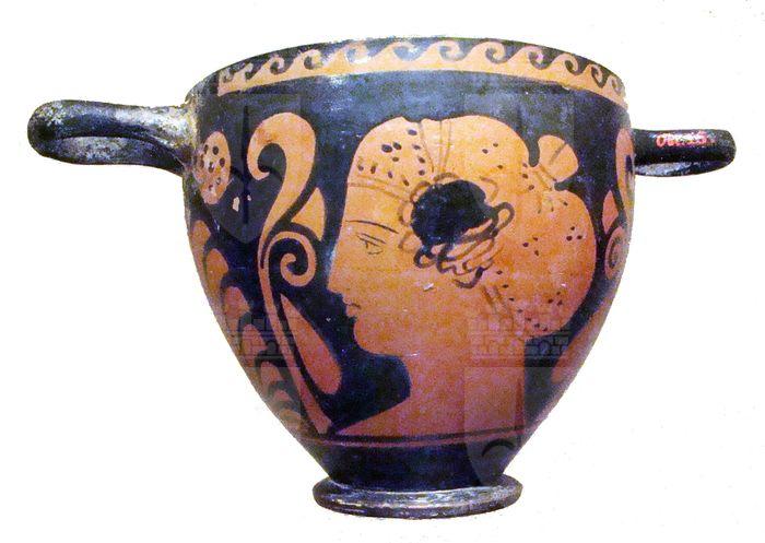 Skyphos a figure rosse. Lato A e B: testa femminile tra antefisse a palmette; motivo ad onda corrente sotto l'orlo.