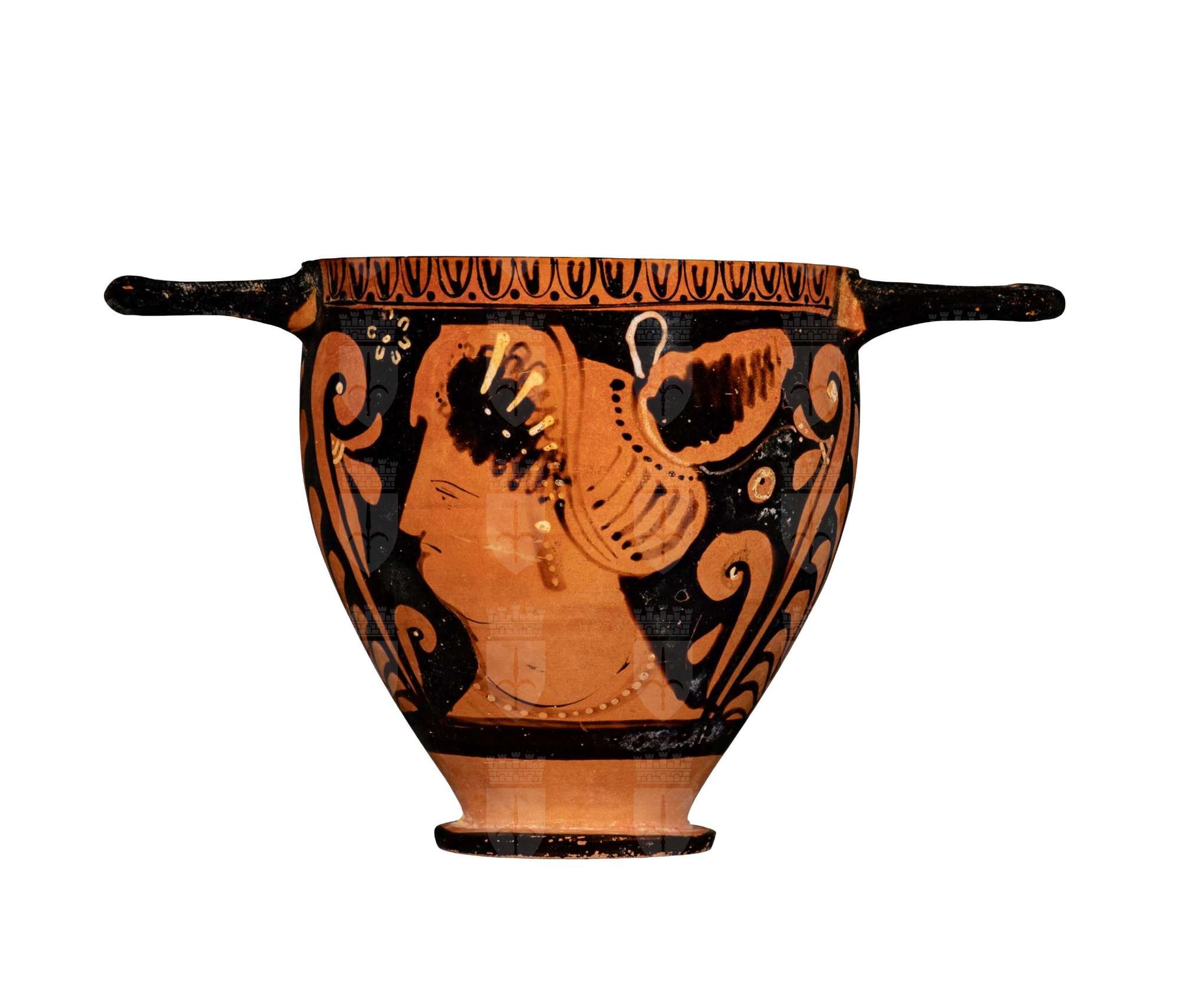 Skyphos apulo a figure rosse, dettagli bianchi; palmette sotto le anse. Lato A: donna seminuda seduta con specchio e bacile con offerte e palla a spicchi. Lato B: testa femminile con mitella.