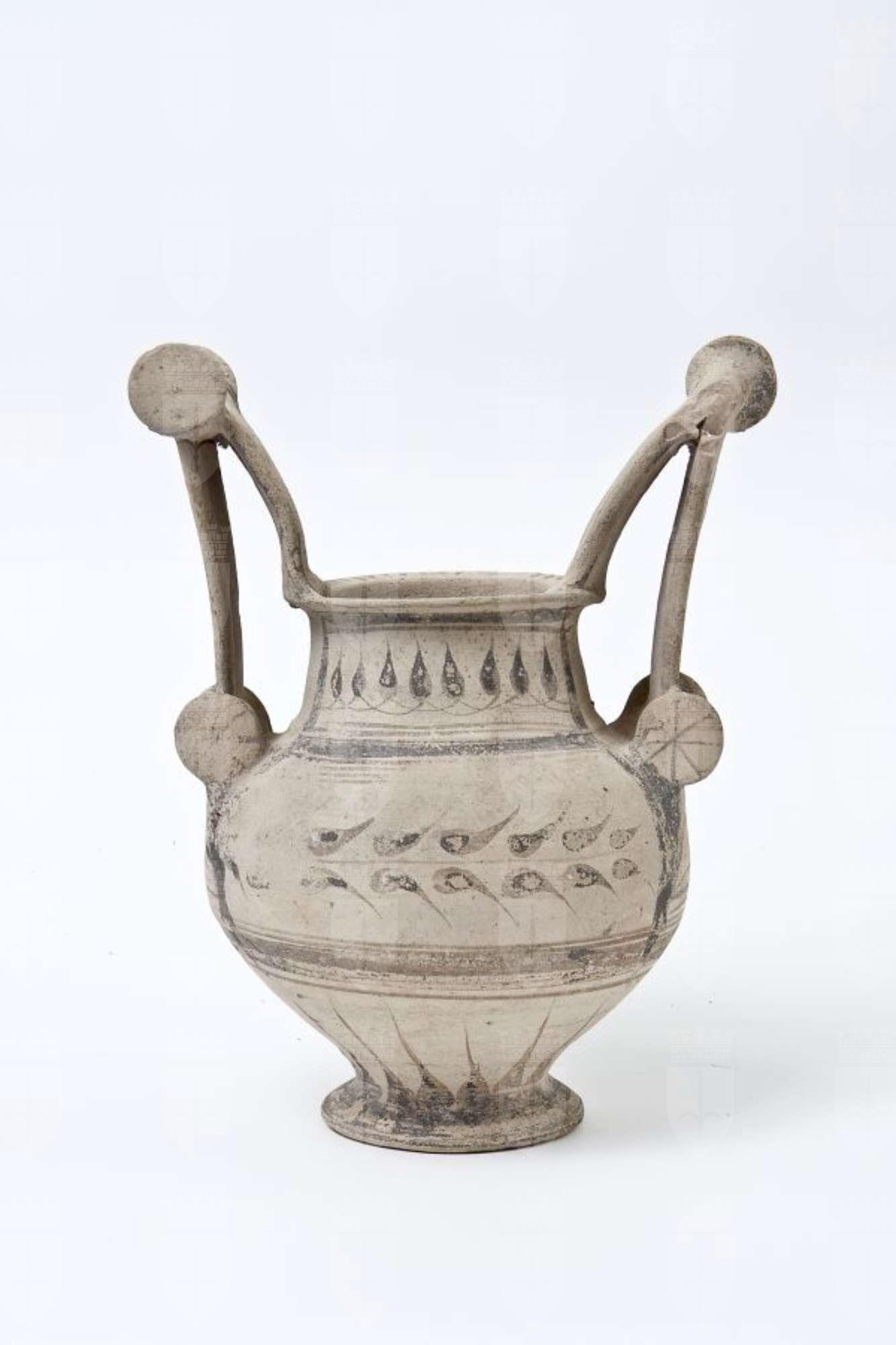 Trozzella in ceramica messapica. Orlo estroflesso e appiattito, basso collo troncoconico, a profilo leggermente convesso, corpo globoso rastremato verso il basso, con anse verticali sormontanti, impostate sull’orlo e sulla spalla, provviste di doppia coppia di dischi (“trozze”), di cui quelli superiori sono di maggiori dimensioni; basso piede a disco. Decorazione monocroma in nero su fondo naturale di argilla; su entrambi i lati, pannelli sul collo e sulla spalla inquadrati da fasce parallele, in cui campeggiano tralci d’edera stilizzati; sull’orlo, tratti; nella parte inferiore del vaso, raggiera di petali.