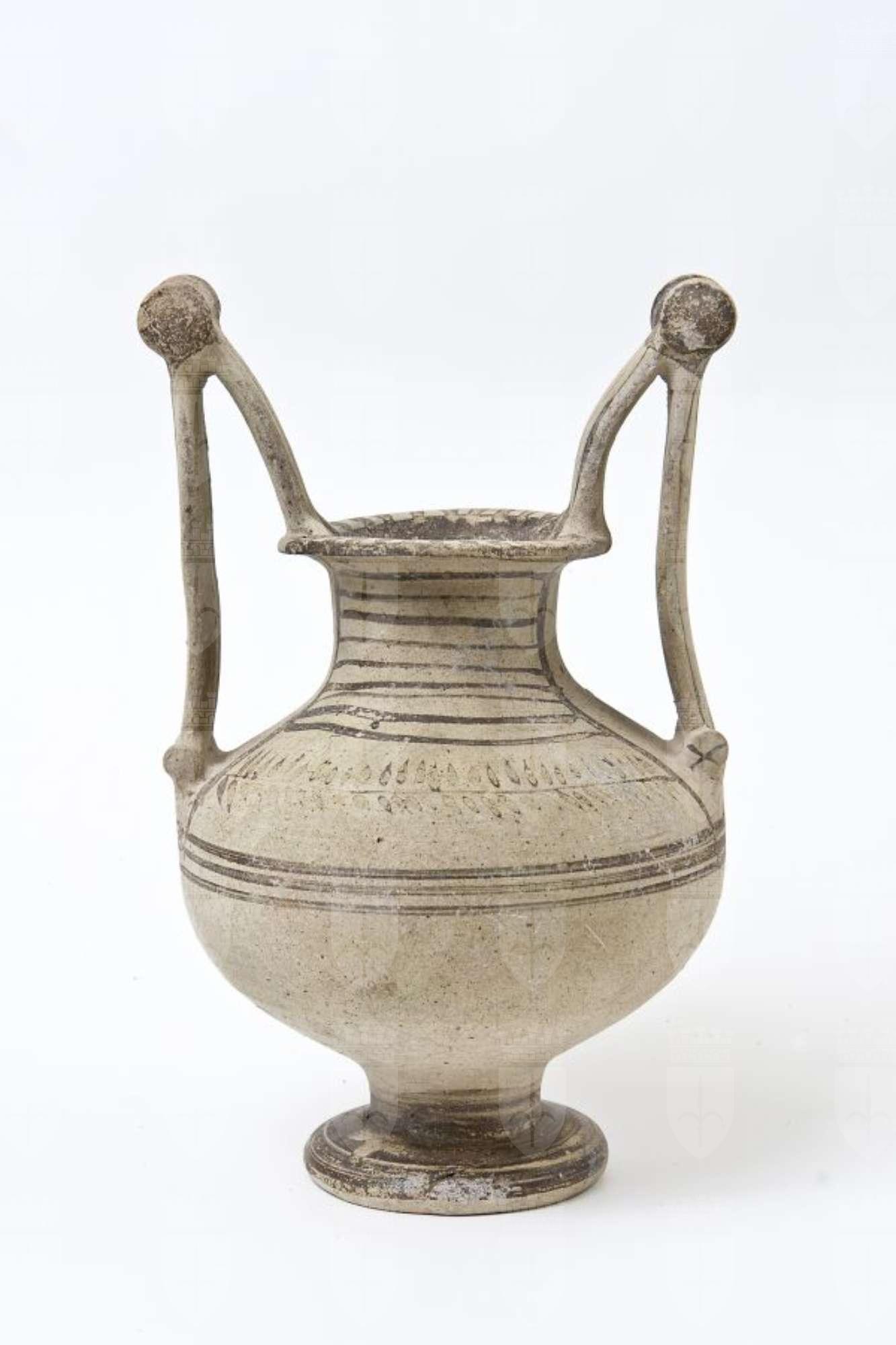 Trozzella in ceramica messapica. Orlo estroflesso e appiattito, alto collo cilindrico, a profilo lievemente concavo, corpo globoso, con anse verticali sormontanti, impostate sull’orlo e sulla spalla, provviste di doppia coppia di dischi (“trozze”), di cui quelli superiori sono di maggiori dimensioni; piede a disco, unito al corpo mediante fusto. Decorazione monocroma in bruno-nerastro, su fondo naturale di argilla, con piede dipinto in bruno; sul collo, linee orizzontali diritte; sulla spalla, una serie di pannelli definiti da linee parallele, in cui su un lato campeggiano palmette isolate, mentre sull’altro un ramo di ulivo. All’altezza del ventre una fascia a tre linee parallele; sulla parte inferiore del fusto, fasce e piede dipinto; sull’orlo, tratti; sulle anse, linee verticali, dischi superiori dipinti, sui dischi inferiori, linee incrociate.
