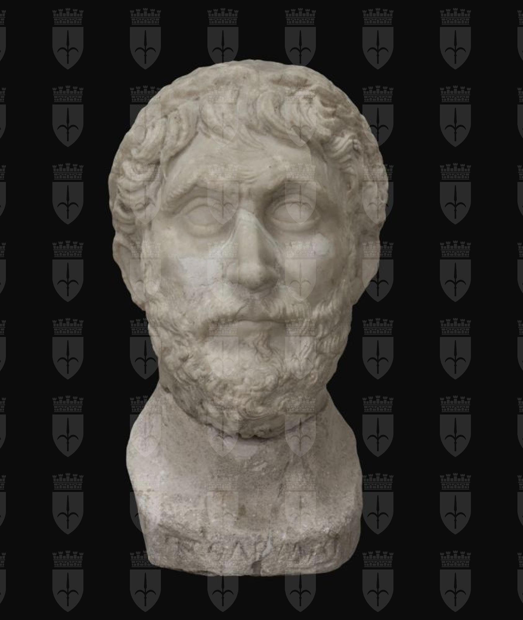 Testa maschile a cui il gioco movimentato dei capelli spioventi a fiamma sulla fronte e a riccioli ai lati, della barba e dei baffi acconciati sul tipo dell’imperatore Antoniono Pio, accresce la linea tormentata del volto. Le sopracciglia rilevate, accompagnando la forte arcata orbitale, formano sulla fronte un complesso di piccole rughe ondulate e danno al volto un’espressione di doloroso stupore. Gli occhi grandi e trasognati si aprono sulle guance stanche e segnate. La bocca ha le labbra strette e la parte superiore lunga e pronunciata. L’insieme è trattato con un certo impressionismo che cura maggiormente la visione frontale. Di lato la lavorazione è trascurata, specie dalla parte destra, dove l’orecchio sembra appena abbozzato e la corona di mirto che adorna la chioma non è ben definita nelle sue parti. Né, d’ambedue le parti, gli orecchi si staccano, ma lievemente sporgenti, formano tutt’uno con la parte posteriore del capo, dove la trattazione dei capelli va man mano diminuendo d’intensità e la corona si riduce ad una semplice sporgenza. Il naso è stato aggiunto da un restauro posteriore e così pure il breve tratto di busto in gesso con la scritta in greco Tolomeo.