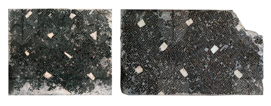 Due pannelli del mosaico della prima fase edilizia appartenuto al corridoio panoramico della facciata sul mare che era coperto da un portico colonnato e si snodava lungo una terrazza a giardino. Il pavimento era a tessellato nero, con tessere disposte con ordito obliquo, con radi inserti ordinati di marmo bianco.