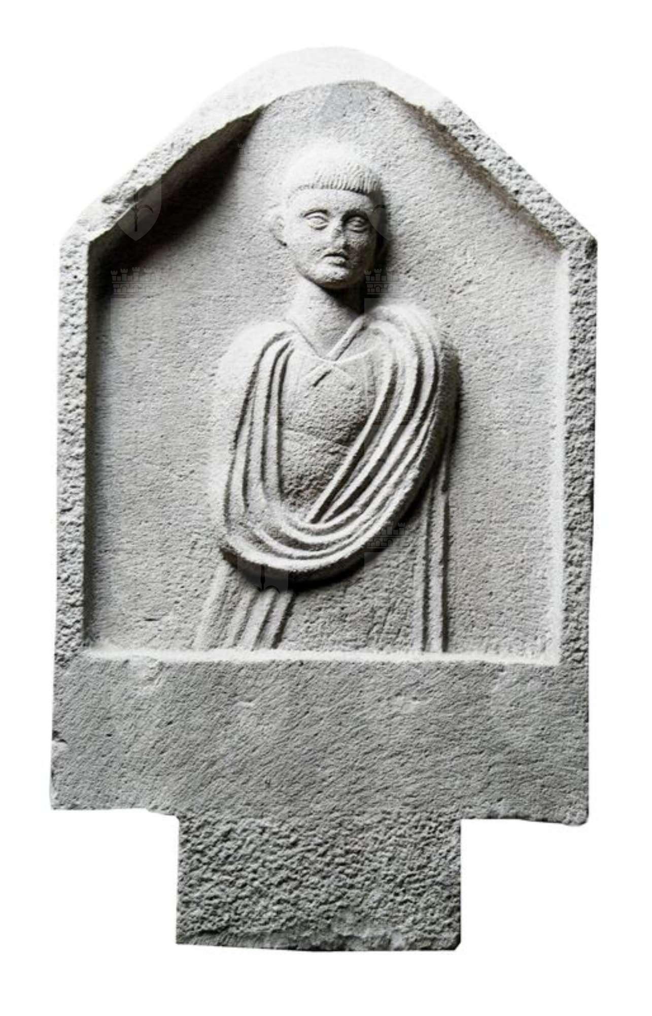 Stele centinata in calcare, con dente del fissaggio del monumento. Entro un riquadro, anch'esso centinato, è realizzato a rilievo un ritratto maschile a mezza figura con tunica e toga con drappeggio "a matassa".