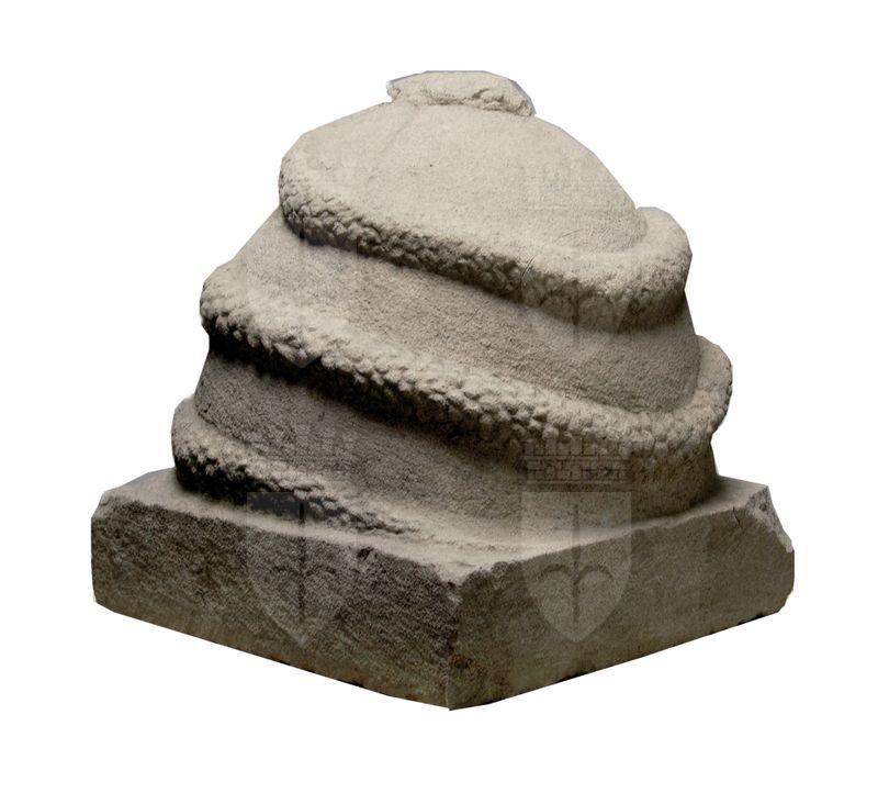 L'onfalo, a forma di uovo con serpente squamato avvinghiato, è vuoto internamente e poggia su uno zoccolo liscio parallelepipedo.