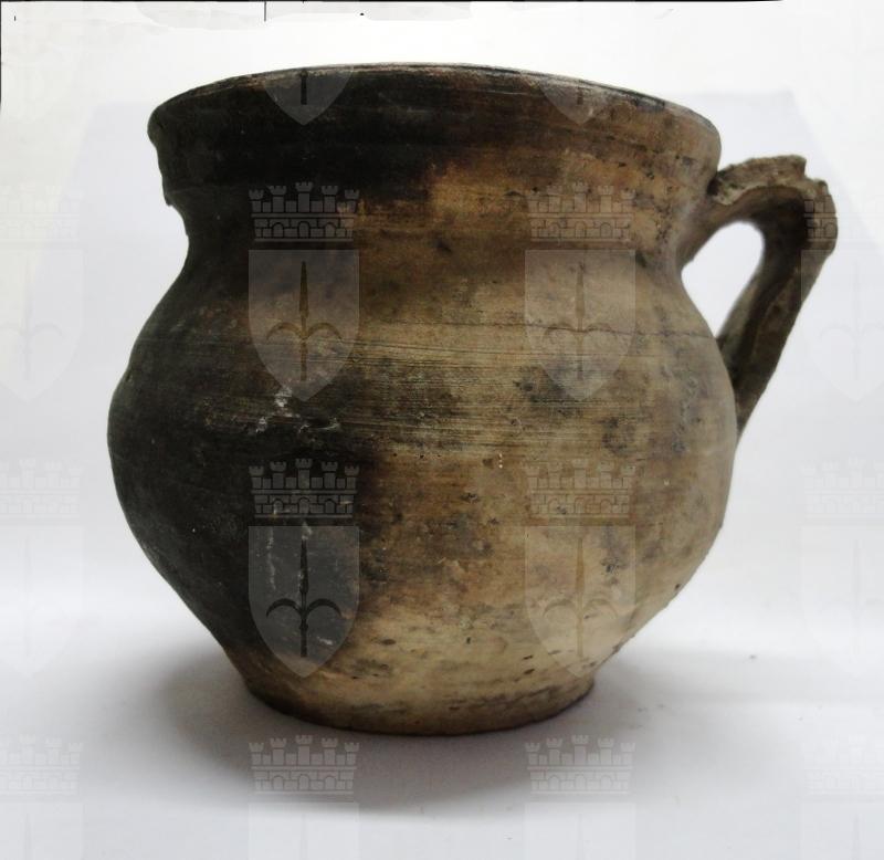 Olletta integra ad alto orlo svasato sagomato; labbro arrotondato; ventre sferico, rastremato verso il fondo; fondo piatto; ansa a nastro con innesti in corrispondenza della gola e del punto di massima espansione del ventre. Conserva internamente la vetrina trasparente impermeabilizzante.