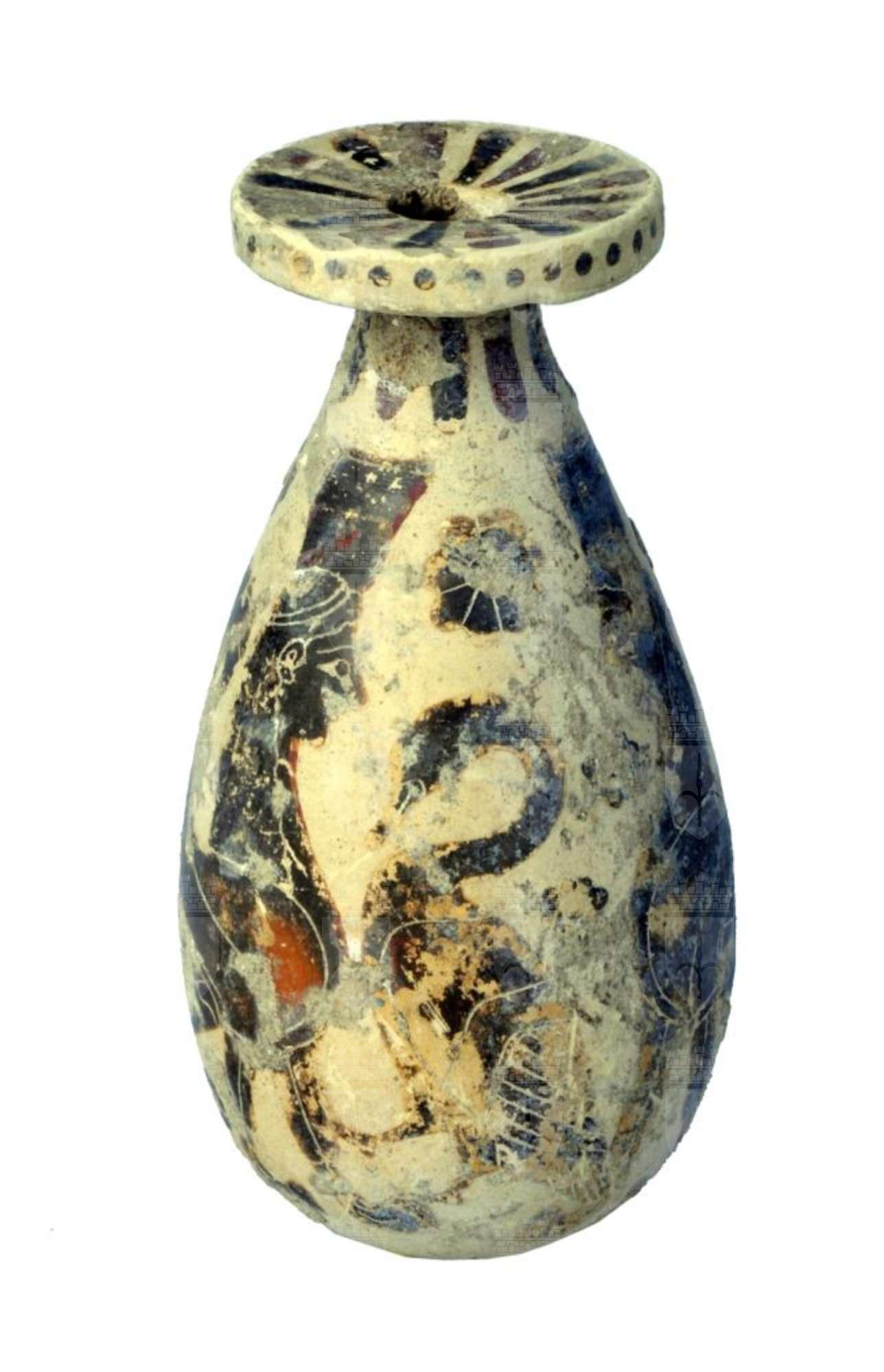 Alabastron piriforme con due animali fantastici (sfingi a corpo di leone, ali e testa femminile) separate da un cigno.