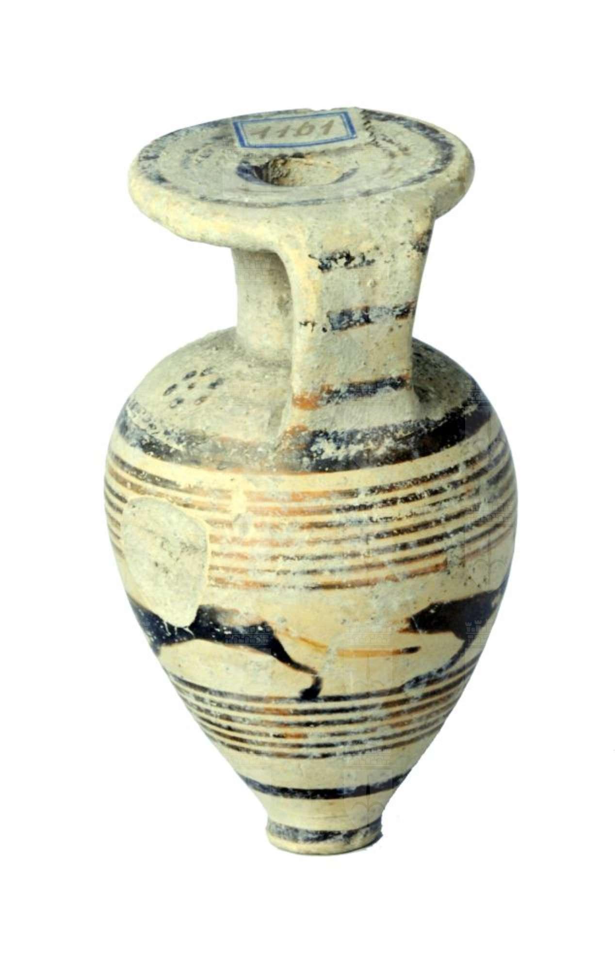 Aryballos piriforme rastremato verso il puntale a fasce con larga zona decorata da tre cani in corsa.