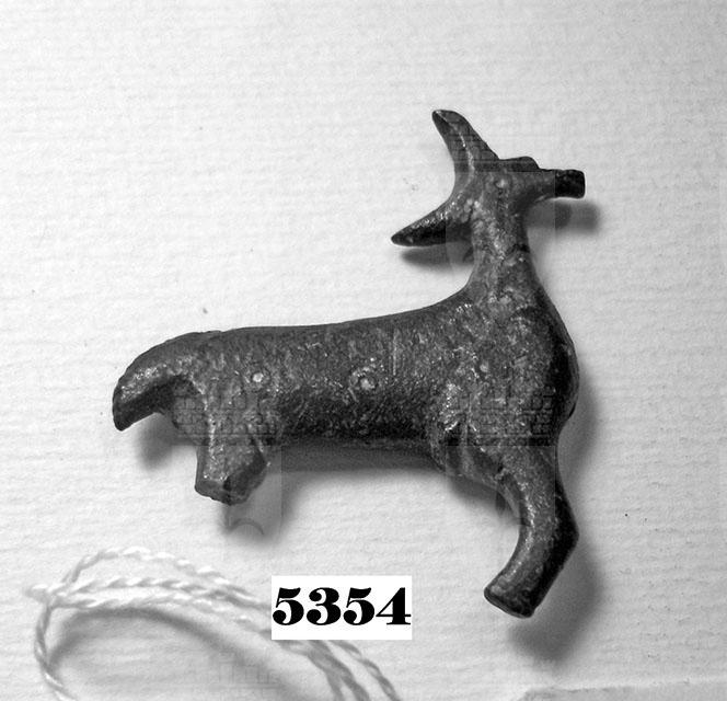 Fibula laminare a forma di cervo, priva dell'ardiglione; l'occhio è raffigurato con un occhio di dado.