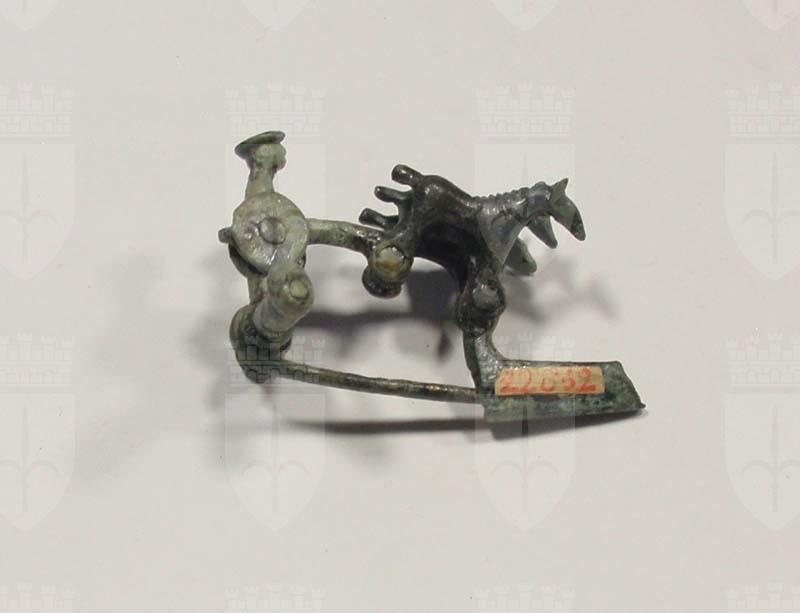 Fibula con arco configurato a guerriero su carro trainato da tre cavalli.