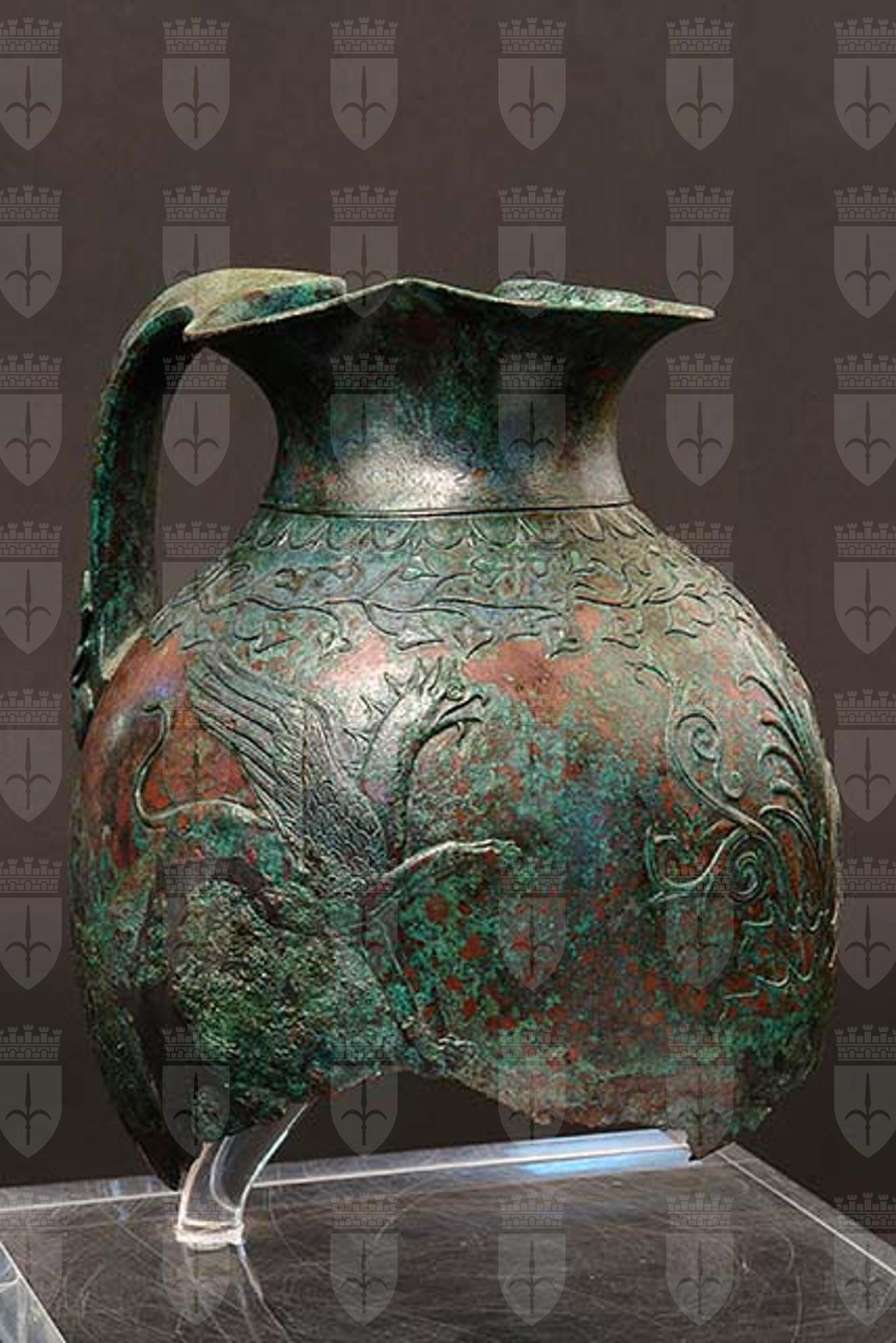 Oinochoe a bocca trilobata, corpo ovoidale, privo del piede e di gran parte del fondo. La decorazione alla Base del collo mostra kymation ionico con ovuli e dardi, sormontati da un listello a rilievo. Sulla spalla, un serto orizzontale ondulato con foglie d'edera cuoriformi appuntite. Sulla fronte del ventre una palmetta a 9 foglie nasce da un cespo d'acanto. Simmetricamente contrapposti, rivolti verso la palmetta, stanno due grifoni stanti, alati e crestati, con zampe e coda leonine, lunga testa dal becco adunco e barbula. Realizzata a parte e legata con saldatura a stagno (brasatura dolce), l'ansa è piena, a sezione triangolare, con attacco inferiore configurato a due mezze teste di cervo viste di profilo e affrontate. Circa la produzione, è stato proposto trattarsi di una delle più antiche elaborazioni tarantine sulla base di modelli attici, altri paralleli stilistici riconducono alle produzioni del Mar Nero.