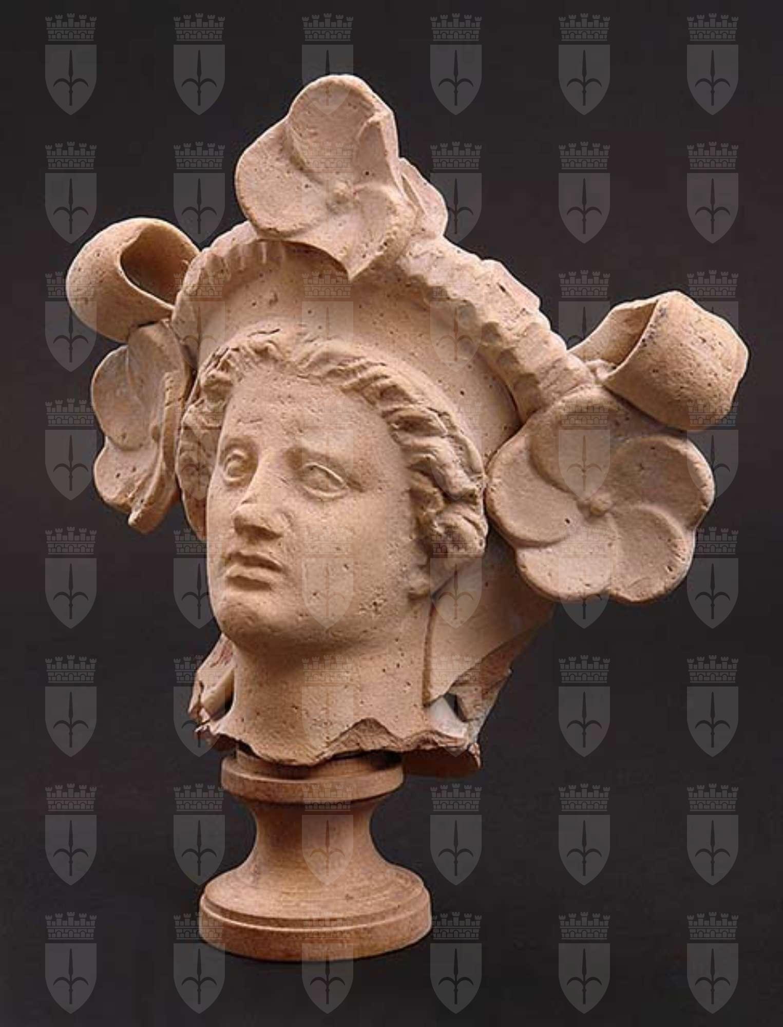 Testa di recumbente dal retro stondato con foro ovale per l'areazione. Volto dalle guance piene, occhi e naso grandi, fronte alta; folta chioma ondulata su cui è un diadema a cercine adorno di rose e bende.
