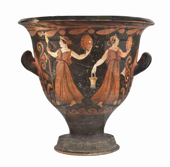 L'imboccatura del vaso è ampia, con orlo estroflesso e labbro marcato da uno spigolo vivo; il corpo è campaniforme e, con un corto stelo, poggia su un piede troncoconico con listello alla base e allo spigolo. Le anse a bastoncello sono impostate orizzontalmente a metà della vasca e incurvate verso l'alto. La vernice nera, tendenzialmente opaca e con diffusi problemi di cottura, copre anche l'interno della vasca del vaso e risparmia l'attaccatura e la parte dietro alle anse; molti dettagli sono resi con sovradipinture bianche e gialle. Il colore dell'argilla oscilla tra Munsell 7.5YR 6/4 (light reddish brown) e 2.5YR 3/6 (dark red). Sul lato A troviamo una scena a tema dionisiaco, con due menadi danzanti: la fanciulla a sinistra è rappresentata con il volto di profilo verso sinistra, con il torso di tre quarti e le gambe in una dinamica posizione di danza, la sini-stra frontale e la destra di profilo; la pelle è resa con sovradipintura bianca. I capelli sono raccolti in un sakkos, da cui esce una ciocca di capelli ricciuti, e sono ornati da un diadema di perle, che si aggiunge agli orecchini con pen-dente in forma di triangolo rovesciato, alla collana, dipinta con semplici trattini paralleli, e ai bracciali. La figura veste un lungo chitone cinto in vita e riccamente pieghettato, decorato con una sottile banda nera verticale, che parte dalla scollatura e arriva ai piedi, tra due file di punti neri: la stoffa leggera fa intravedere le forme del corpo. Entrambe le braccia sono tese: la destra regge un tirso, la sinistra un tamburello. La menade a destra è molto simile all'altra e sostanzialmente simmetrica: il volto è di profilo, il torso di tre quarti con la gamba destra di fronte e la sinistra di profilo. I capelli sono raccolti nel sakkos, ma in questo caso oltre a una ciocca ne esce lo chignon. I gioielli e il chitone sono analoghi a quelli dell'altra menade. Diversi sono gli attributi: il braccio destro, proteso verso il basso, regge una situla, dipinta in giallo a rappresentare il bronzo, mentre il sinistro, leggermente flesso, un tamburello. Una sottile linea ondulata a risparmio segna il piano della scena. Sul lato B compaiono due giovani ammantati: quello a sinistra è completamente di profilo a destra, stante, con la gamba destra leggermente flessa. I capelli sono corti e ricciuti e la testa è ornata da un diadema, in bianco, con un ornamento centrale. L'himation, con pieghe accuratamente segnate e un lungo drappeggio che, dalla spalla, scende fino ai piedi, nasconde completamente le forme del corpo. Il giovane ammantato a destra è stante, ha il volto di profilo, rivolto a sinistra verso l'altro personaggio, il torso di tre quarti, la gamba destra di profilo e la sini-stra frontale, leggermente flessa. Il volto è analogo a quello del giovane a sinistra, ma in questo caso l'himation lascia il torso scoperto fino alla vita, sulla quale ricade con ricche pieghe, retto dalla spalla e dal braccio sinistri. Il braccio destro è teso e regge una phiale con offerte, rappresentate da punti bianchi. Compaiono alcuni dettagli secondari in bianco: in altro alcuni semplici motivi floreali a tre petali (a sinistra, tra le figure e a destra) e due tralci di vite tra le figure; a terra una pianta con fiori a spiga. Le decorazioni accessorie comprendono un tralcio di alloro con bacche, sinistrorso, subito sotto il labbro, un mo-tivo a palmetta da cui si dipartono girali fogliati e fioriti con campanule ai lati delle figure e, in basso, un motivo a onde marine capovolte destrorse; i girali e i fiori hanno dettagli sovradipinti in bianco. Sulla parte superiore dell'orlo sono conservate due etichette, una recante la data di acquisizione da parte del museo «16 febbraio 1904», l'altra con un numero di inventario il cui significato non è interpretabile: «72». L'attuale numero di inventario generale è tracciato a inchiostro rosso nella medesima zona.