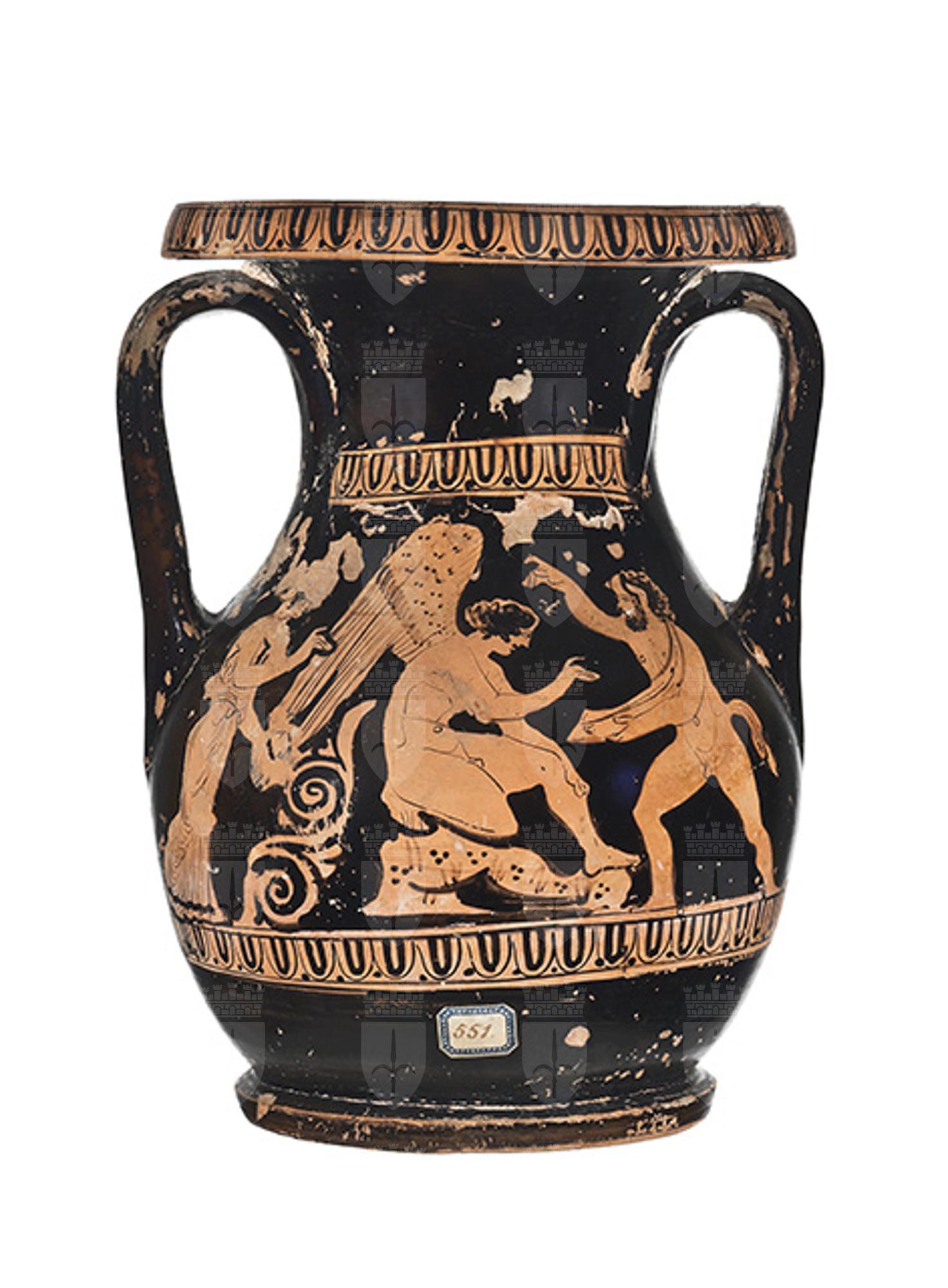 Argilla giallo rossastra (5YR 6/6 Munsell); vernice lucente, di buona qualità, ben conservata ma scalfita e diluita in alcuni punti. Le scalfitture sono presenti su tutte le zone del vaso in maniera omogenea; in particolar modo presso la zona dell'orlo, del collo, delle anse e del piede. Il vaso presenta un corpo piriforme con breve collo a profilo concavo, labbro estroflesso e largo piede a disco. La coppia di anse verticali a nastro è impostata tra spalla e collo. Decorazione del lato A: al centro della scena è raffigurato di prospetto un erote alato seduto. Il piumaggio delle ali è stato reso in modo stilizzato per mezzo di puntini e una fitta fila di trattini verticali nella parte superiore, mentre parte inferiore delle ali è resa con una decorazione a nette linee incise, interrotte soltanto per dare spazio alla mano della donna sulla sinistra. Il supporto su cui è accovacciato l'erote, invece, è costituito da una roccia, il cui materiale è reso da un motivo di tre puntini alternati a doppi trattini verticali. La figura femminile, raffigurata di profilo e vestita con uno stretto chitone drappeggiato, è ritratta nell'atto di reggere forse uno strumento. A destra dell'erote, invece, è raffigurato un satiro barbato danzante, con coda e orecchie equine, che regge un otre con il braccio e la mano sinistra. Decorazione del lato B: sono raffigurati due giovani ammantati, stanti e di profilo, a colloquio. I due sono ritratti uno di fronte all'altro, entrambi rivolti verso il centro della scena. Il giovane a destra porta il peso sulla sola gamba destra, mentre l'altra, il cui polpaccio è lasciato appena scoperto dalla veste, è piegata, a riposo. Tra i due, proprio al centro della scena, è raffigurato un oggetto di forma circolare, forato al centro, identificabile come un altere (peso usato nelle gare di salto in lungo). La decorazione accessoria è costituita da un meandro costituito dalla sequenza ovulo-guscio-puntino, che si ritrova non solo sul labbro, ma anche sopra e sotto le scene figurate. Due sottili filetti graffiti decorano rispettivamente il punto di stacco tra ventre e piede e il bordo superiore dello spessore del piede.