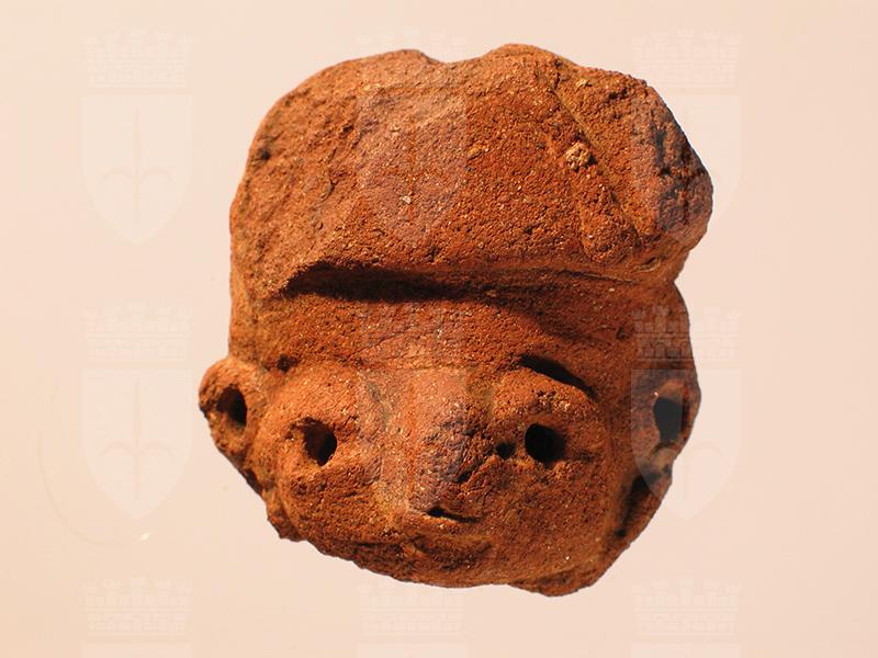 Miniatura fittile di una testa umana di stile Usulután modellata con impasto di argilla rossa. I tratti del volto sono interpretati in modo sommario ma efficace. La parte inferiore del viso è danneggiata perciò alcuni elementi emergono con maggior forza: i cerchi forati degli occhi e delle orecchie. Il naso è una protuberanza indistinta. La testa è sormontata da un copricapo a turbante ornato con nastri che ricadono sul davanti. Probabilmente faceva parte di una figurina intera la cui produzione è molto frequente nella ceramica Usulután.