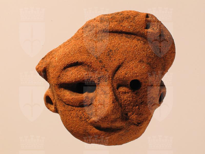 Miniatura fittile di stile Usulután raffigurante una testa umana. Realizzata a pasta piena, poggia su una base irregolare. I tratti del viso, seppure sommari, sono efficaci. Gli occhi hanno le palpebre in rilievo e un profondo foro al posto dell’iride, in questo probabilmente era incastonato un frammento di altro materiale decorativo. Anche gli orecchini presentano un foro analogo. La fronte sembra cinta da un’ampia fascia di tessuto a torciglione, come è ancora in uso presso alcune etnie dell’area Maya. Sulla superficie resta qualche traccia dell’ingobbio annerito.