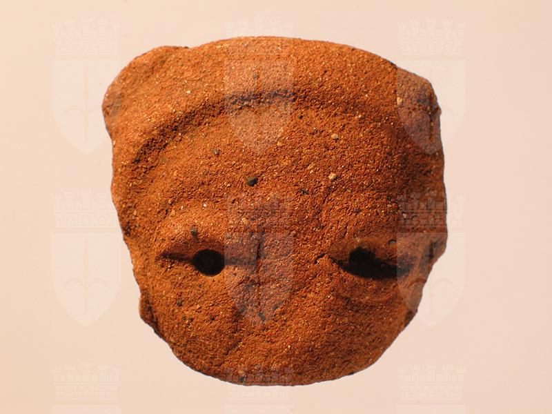 Testina umana di stile Usulután in miniatura appena abbozzata in un blocco di argilla. La superficie è ruvida e mostra la presenza degli elementi sgrassanti nell’impasto. Dei tratti somatici si distinguono appena gli occhi, resi con una leggera scanalatura e un foro per l’iride. Dalla testa si distacca una fascia liscia che avvolge la fronte e la nuca e che dietro appare in rilievo.