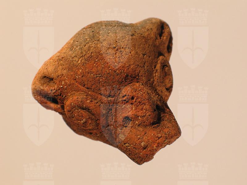 Testina di animale modellata in terracotta, di stile Usulután. L’interno è cavo, come si nota dal largo foro presente sotto al muso. La testa è rotonda con orecchie semicircolari in rilievo sulle quali sono visibili tre linee incise. Il muso è piuttosto allungato e ricorda quello di un formichiere o di un coatì. Dietro al collo si nota un accenno di presina ad anello che serviva per appendere l’oggetto. La superficie era stata ingobbiata. In alcune zone sono presenti delle bruciature.