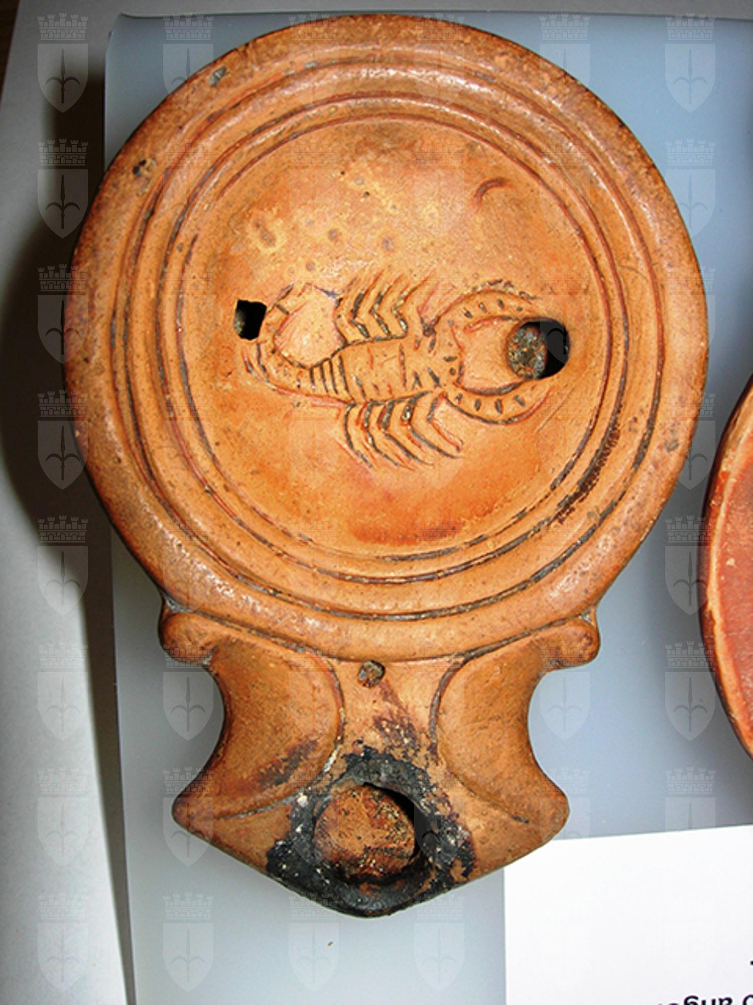 lucerna a volute con becco angolare, sul disco scorpione a destra