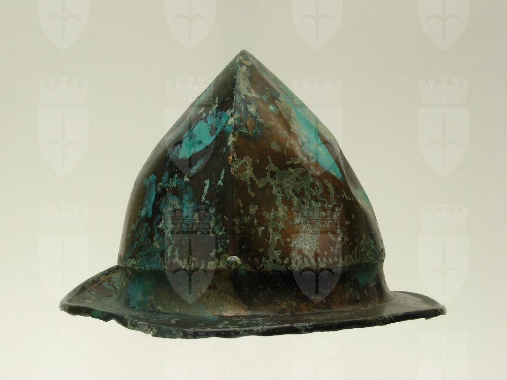 Elmo di tipo Negau di produzione etrusco-italica. Caratterizzato da una calotta a base circolare che presenta in cima una costolatura in senso longitudinale. La base è costituita da una breve tesa dall'orlo arrotolato all'insù. La base della calotta è decorata da un motivo inciso che ricorda una serie di palmette o elementi vegetali. L'elmo fu rinvenuto nel 1929 nel corso della prima indagine della grotta stessa che da esso prese il nome.
