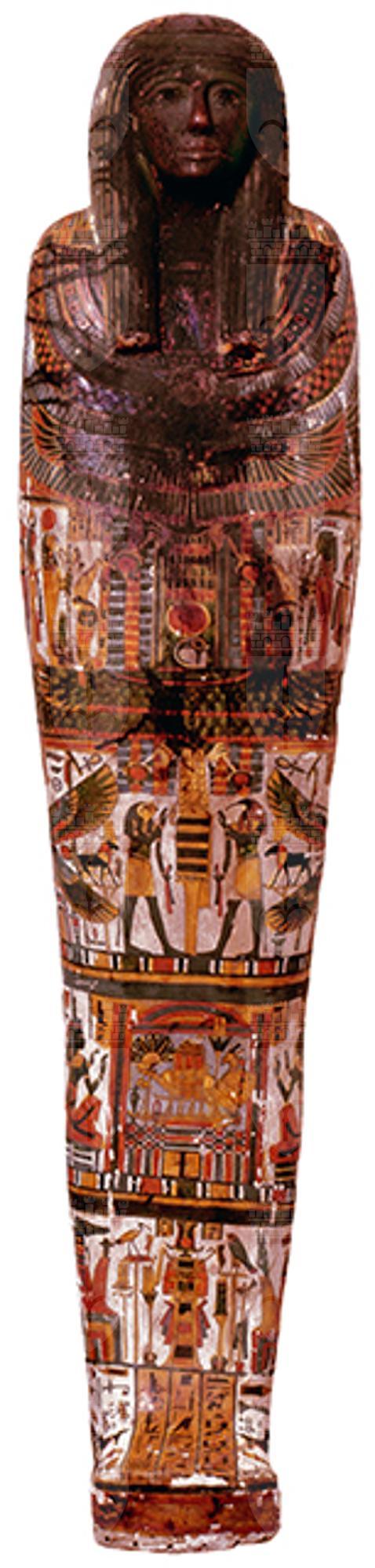 L'involucro per la mummia è fatto in cartonnage, un materiale ottenuto dalla sovrapposizione di strati di stoffa di lino (o di papiro) incollati e pressati, la cui superficie poi veniva stuccata con gesso e dipinta; accuratamente tagliato probabilmente tra la fine del XIX e l'inizio del XX secolo per esporre la mummia che era al suo interno, ha ora una parte anteriore e una parte posteriore, la quale composta da due pezzi simmetrici longitudinali, uniti originariamente da legacci di fibra naturale, priva di testo e di figure. La parte superiore, invece, è riccamente decorata: il volto presenta una singolare espressione di bellezza e perfezione di modellato, la parrucca è a due bande che ricadono sul petto e sul collare usekh. Sul vertice del capo è raffigurato uno scarabeo. Il volto e parte del petto sono coperti da una sostanza apparentemente bituminosa di colore scuro. Al di sotto del collare si sviluppano diversi registri decorativi sovrapposti: - La dea Nut ad ali spiegate, accompagnata da due brevi iscrizioni geroglifiche che recitano "Behdety dio grande"; - Al centro il falco Horo, con disco solare in capo e ali spiegate, regge in ambedue gli artigli il simbolo shen dell’eternità e ha un cobra sulle ali. Sopra le ali, su ciascun lato, tre divinità funerarie mummiformi in piedi: a sinistra Ra a testa di falco, Amseti con testa umana e Hapi a testa di babbuino (dietro vi è un falco sopra uno stendardo dell'Occidente); a destra Atum, Kebehsenuf a testa di falco e Duamutef con testa di sciacallo; dietro ancora un airone su uno stendardo. Restano tracce dei nomi delle divinità funerarie in geroglifico; - Al centro vi è il feticcio di Abido, col disco solare alla base della corona atef e un serpente ureo con la corona dell’Alto Egitto; è fiancheggiato a destra dal dio Thot a testa di ibis, dalla dea Uto dalla testa leonina e dal corpo di serpente munito di ali, e dal simbolo dell'Occidente; a sinistra dal dio Horo a testa di falco, di nuovo la dea Uto alata e stavolta lo scettro sekhem. Tra le ali della dea compare un ariete su stendardo; - La barca celeste Henu, al centro, è collocata entro un naos e presenta uguali caratteristiche rispetto a quella del coperchio. Adorano la barca due dee inginocchiate su un basso podio: a sinistra la dea Iside "signora dell’Occidente", inginocchiata, e a destra Nefti "sorella del dio, signora dell’Occidente"; - Al centro della scena si erge il pilastro djed, qui identificato con Osiride in quanto porta la corona ated, lo scettro e il flagello, oltre che la mantellina che ricopre di solito le spalle di Osiride. L'identificazione è garantita anche dalla breve iscrizione geroglifica, che recita "Osiride, signore dell'eternità". Il pilastro è affiancato a sinistra da un ibis su uno stendardo davanti ad un genio mummiforme a testa di coccodrillo accucciato su un piedistallo, a destra da un falco su stendardo e un genio mummiforme a testa di falco. Le due brevi iscrizioni alle estremità chiariscono l'azione rappresentata: "Fare protezione sull'Osiride (= il defunto)". - La zona centrale del rialzo dei piedi è occupata da un testo geroglifico distribuito su tre colonne. Ai lati di quest'ultima è raffigurato uno sciacallo accucciato in mezzo a segni riempitivi, e con due differenti iscrizioni che lo identificano: a sinistra "Upuaut meridionale, guida delle Due Terre, seguace dell’Enneade di Osiride", a destra "Upuaut settentrionale, guida del cielo, seguace dell’Enneade di Horo".