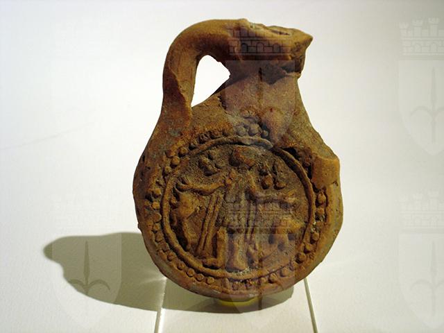 Ampolla piatta in argilla nocciola rosata, depurata, priva di un’ansa, con scheggiature sul bordo del collo e sull’ansa superstite. Incrostazioni sulla superficie. Sulle due facce dell’ampolla, entro un medaglione piatto delimitato da un bordo perlinato che circoscrive un anello a rilievo, vi è la medesima scena: San Menas, con l’abito militare, in atteggiamento di preghiera. La testa è inquadrata da una croce greca sulla destra e da una croce a forma di fiore quadripetalo sulla sinistra. Ai piedi del santo, i due cammelli sono di dimensioni diverse (quello sinistro è più piccolo e senza coda).
