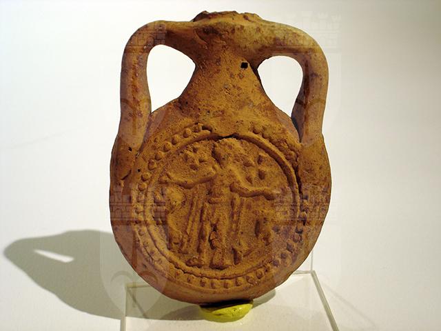 Ampolla piatta in argilla nocciola rosata con tracce di ingobbiatura di colore scuro e priva del collo; ottenuta da matrice abbastanza fresca. Su entrambi i lati dell’ampolla, entro una cornice di perline rilevate tra due anelli, vi è la medesima scena: il santo è raffigurato al centro, in posizione di orante, tra due cammelli (di dimensioni diverse). Sul lato A, attorno al capo del santo vi sono due croci greche a globetti, di cui quella a sinistra è più piccola; sul lato B le due croci sono a forma di piccolo fiore a quattro petali. Il livello di dettaglio delle incisioni è notevole.