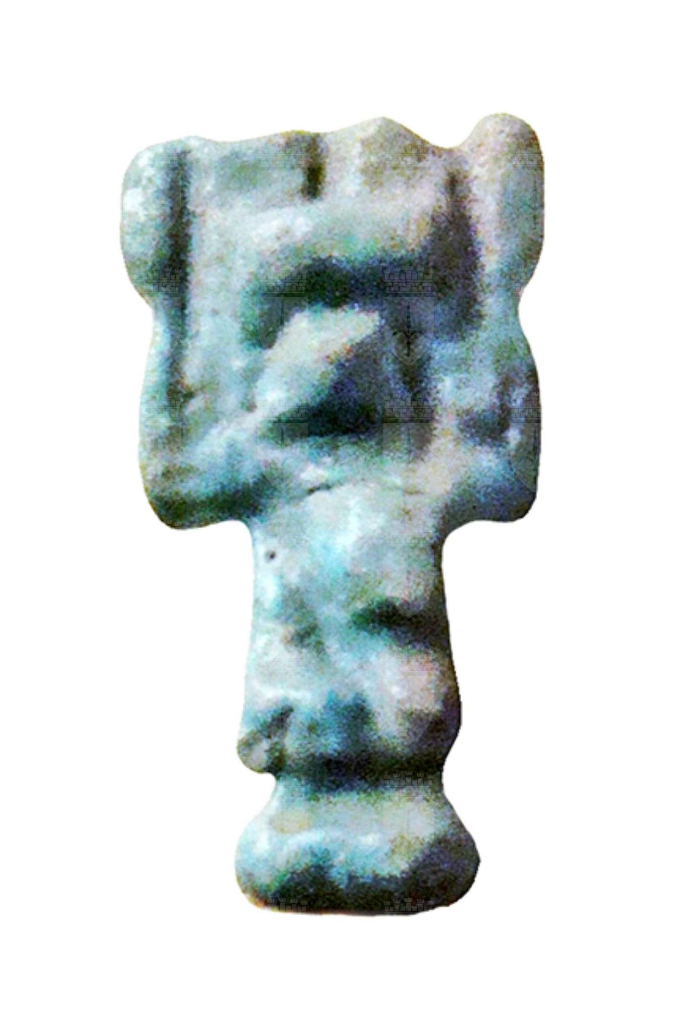 Amuleto in faience, alquanto stilizzato, raffigurante il dio dell'aria Shu. Il dio è raffigurato inginocchiato, con indosso un gonnellino e con le braccia alzate simmetricamente a reggere un disco solare sopra il capo. I piedi poggiano su una piccola base parallelepipeda, che dietro si sviluppa nel pilastro dorsale, forato per permettere la sospensione dell'amuleto.