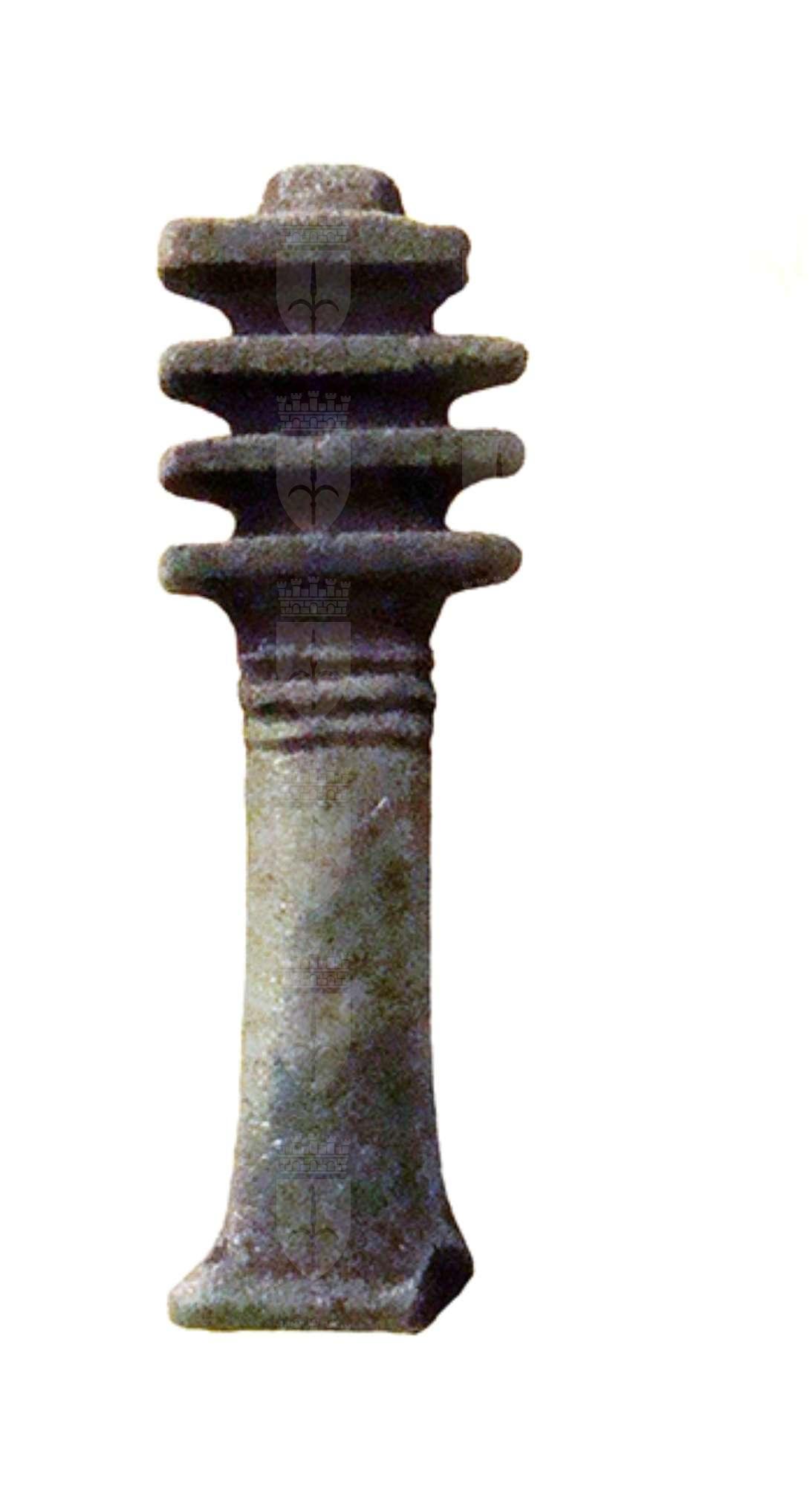 Amuleto in faience, con pilastro dorsale forato, che raffigura il geroglifico "djed", a forma di pilastro con quattro espansioni nella parte superiore, che indica stabilità, immutabilità, eternità, resurrezione, ma anche forza inestinguibile ed incorruttibilità. Già nella Prima Dinastia (3150 – 2925 a.C.) era un pilastro intorno al quale venivano legate spighe di grano; dal Nuovo Regno (1543 – 1078 a.C.) fu interpretato anche come spina dorsale di Osiride. Un djed, meglio se in oro, era posto sulla gola del defunto durante il suo funerale, con il compito di farlo divenire uno spirito santificato e perfetto, un seguace di Osiride. Nel capitolo 155 del Libro dei Morti l’amuleto fa sì che “è tua nuovamente la tua spina dorsale e le tue vertebre, così che puoi tornare a muoverti...”.