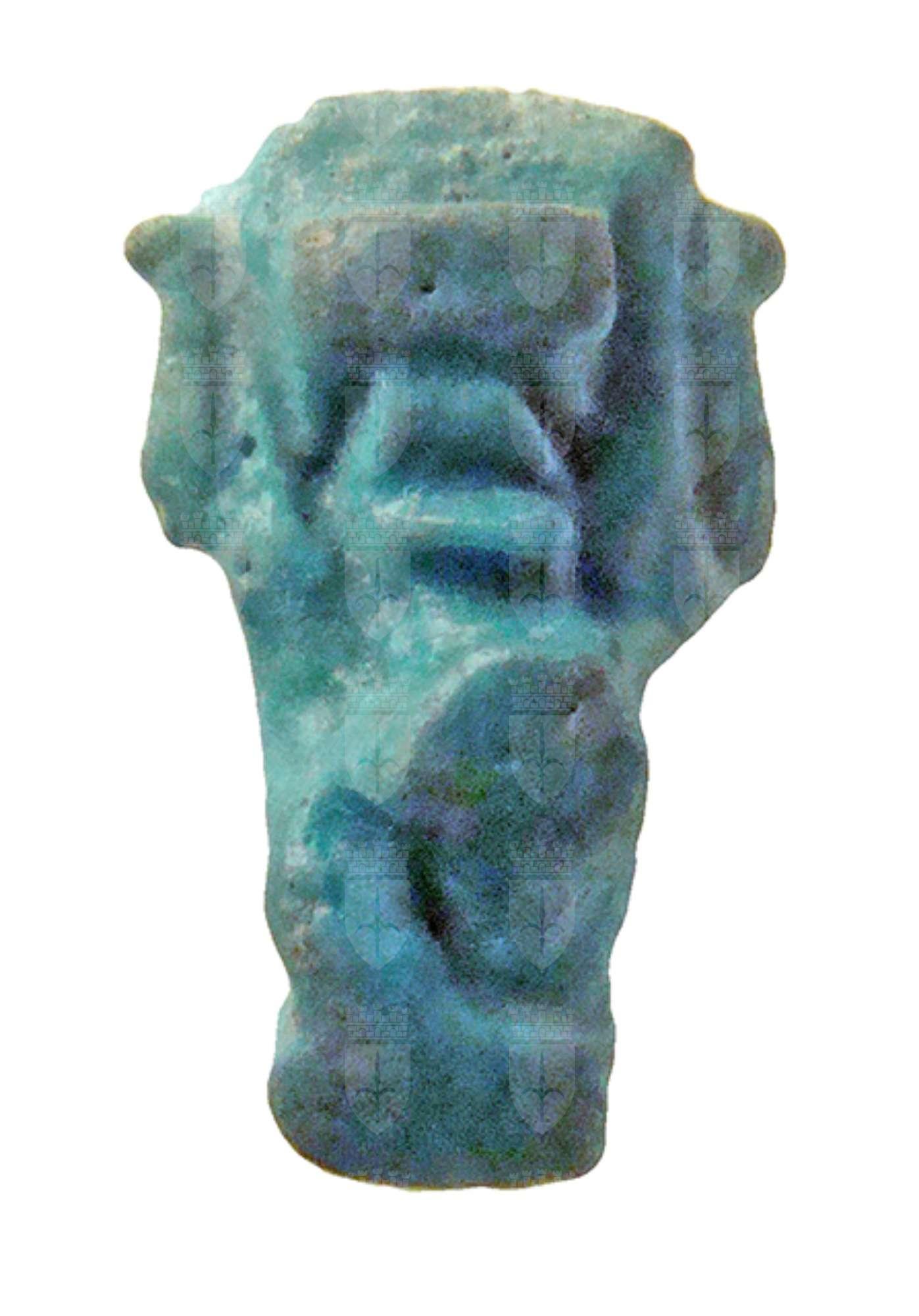 Amuleto in faience, alquanto stilizzato, raffigurante il dio dell'aria Shu. Il dio è raffigurato inginocchiato, con indosso un gonnellino e con le braccia alzate simmetricamente a reggere un disco solare sopra il capo. I piedi poggiano su una piccola base parallelepipeda. All'altezza della testa è stato ricavato un foro passante.