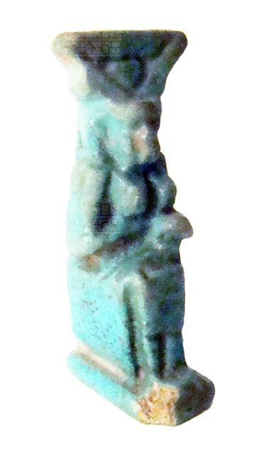 Amuleto in faience raffigurante Iside seduta su un trono, raffigurata nell’atto di allattare il figlioletto Horus, disteso sulle sue ginocchia. Sul capo Iside porta la corona con le due corna bovine tra cui vi è il disco solare (la stilizzazione della figura rende simile questa corona alla raffigurazione di un fiore di loto, forse volutamente); i piedi poggiano su una base, la quale prosegue dietro nel pilastro dorsale, forato per permettere la sospensione dell'amuleto.