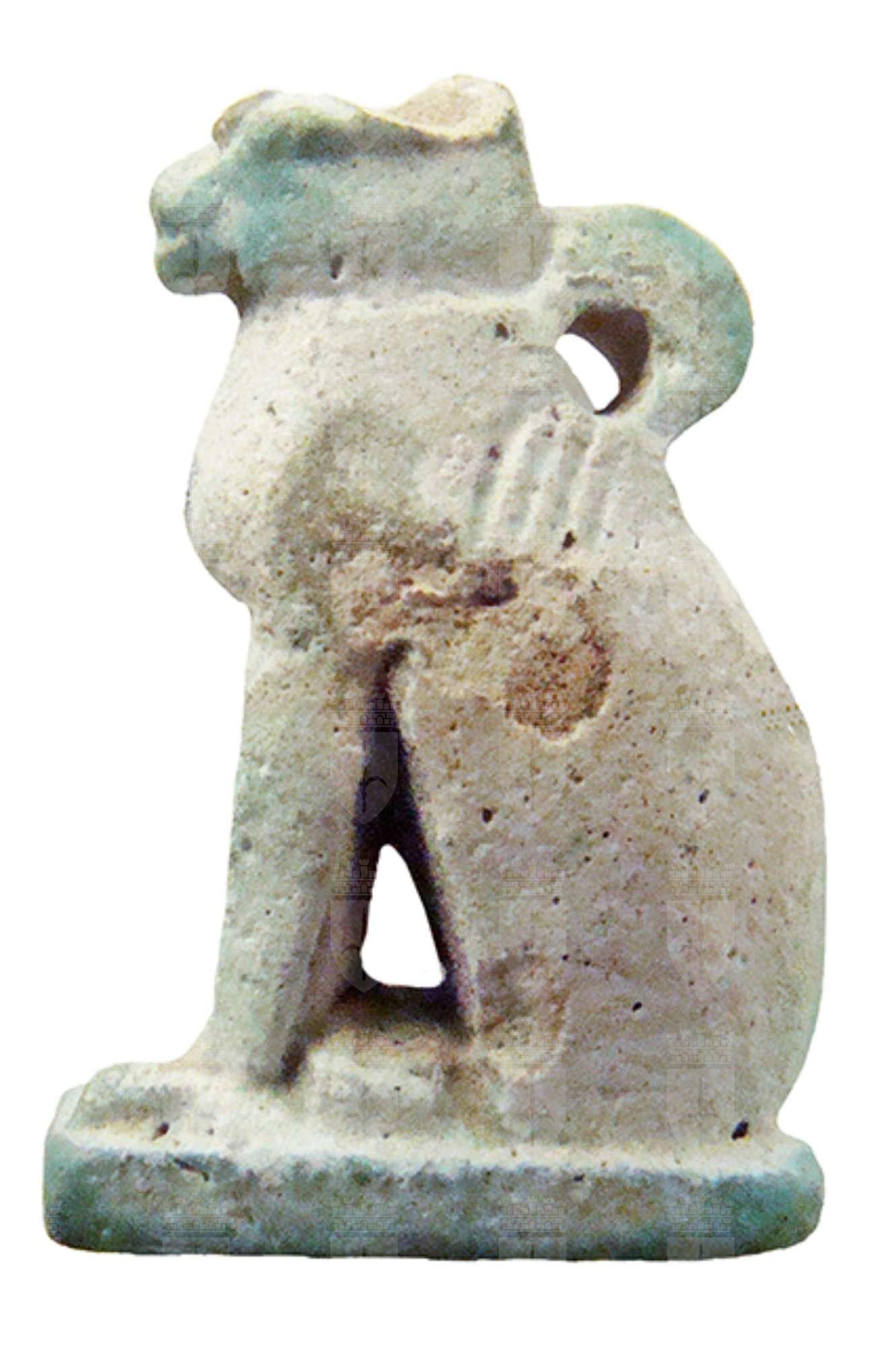 Amuleto in faience lavorato a tutto tondo, raffigurante un gatto seduto su una piccola base; sulla schiena vi è un anello di sospensione, mentre le orecchie sono spezzate.