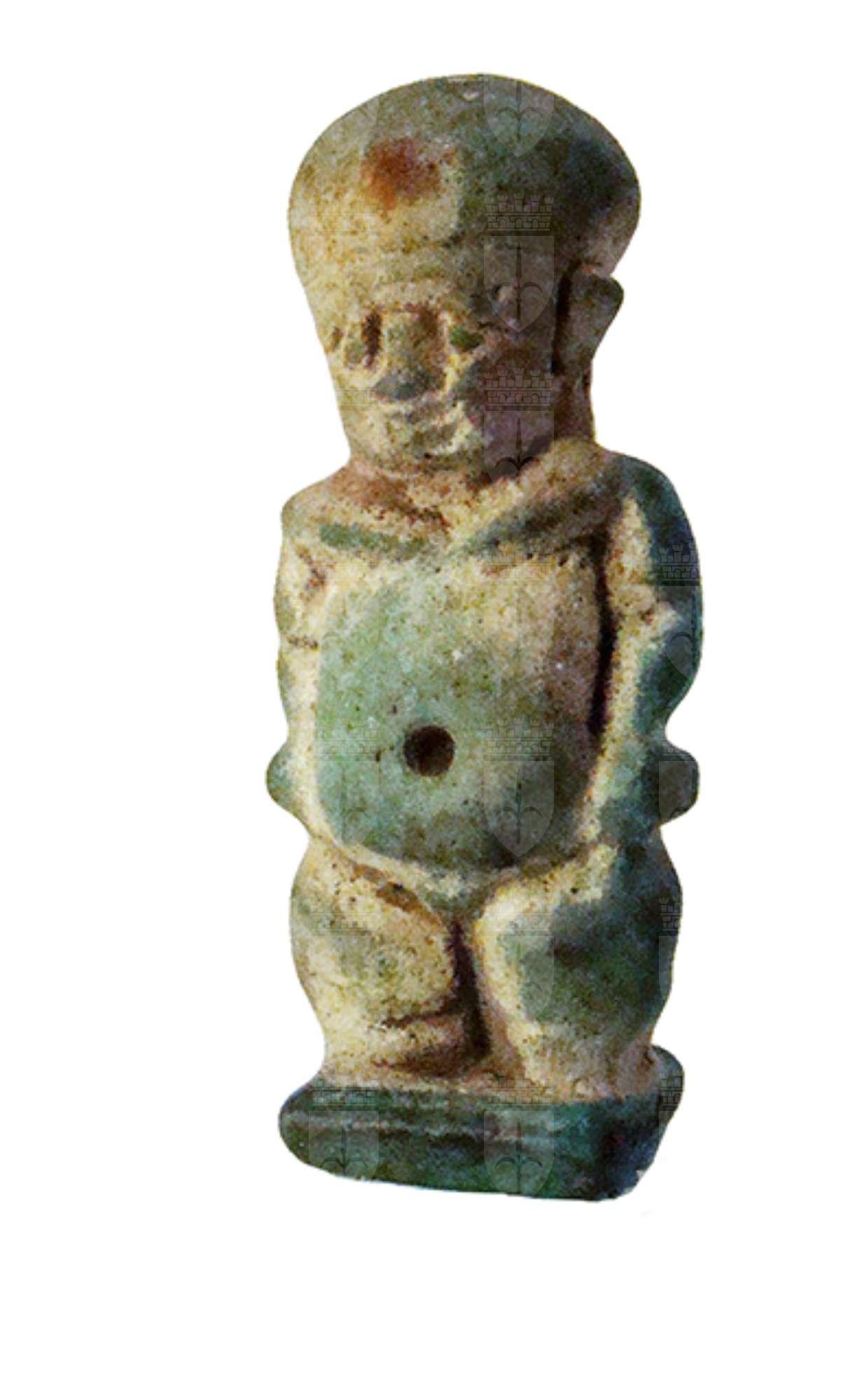 Amuleto in faience, raffigurante il dio minore Pateco, associato al dio Ptah e protettore degli artigiani. Il dio ha il corpo di un nano: nudo, ha la testa grande, normalmente rasata o con la calotta tipica di Ptah, il corpo tozzo e le gambe arcuate, con le braccia appoggiate sulle cosce e i piedi uniti che poggiano su una piccola base. Dietro il collo vi è un anello di sospensione.