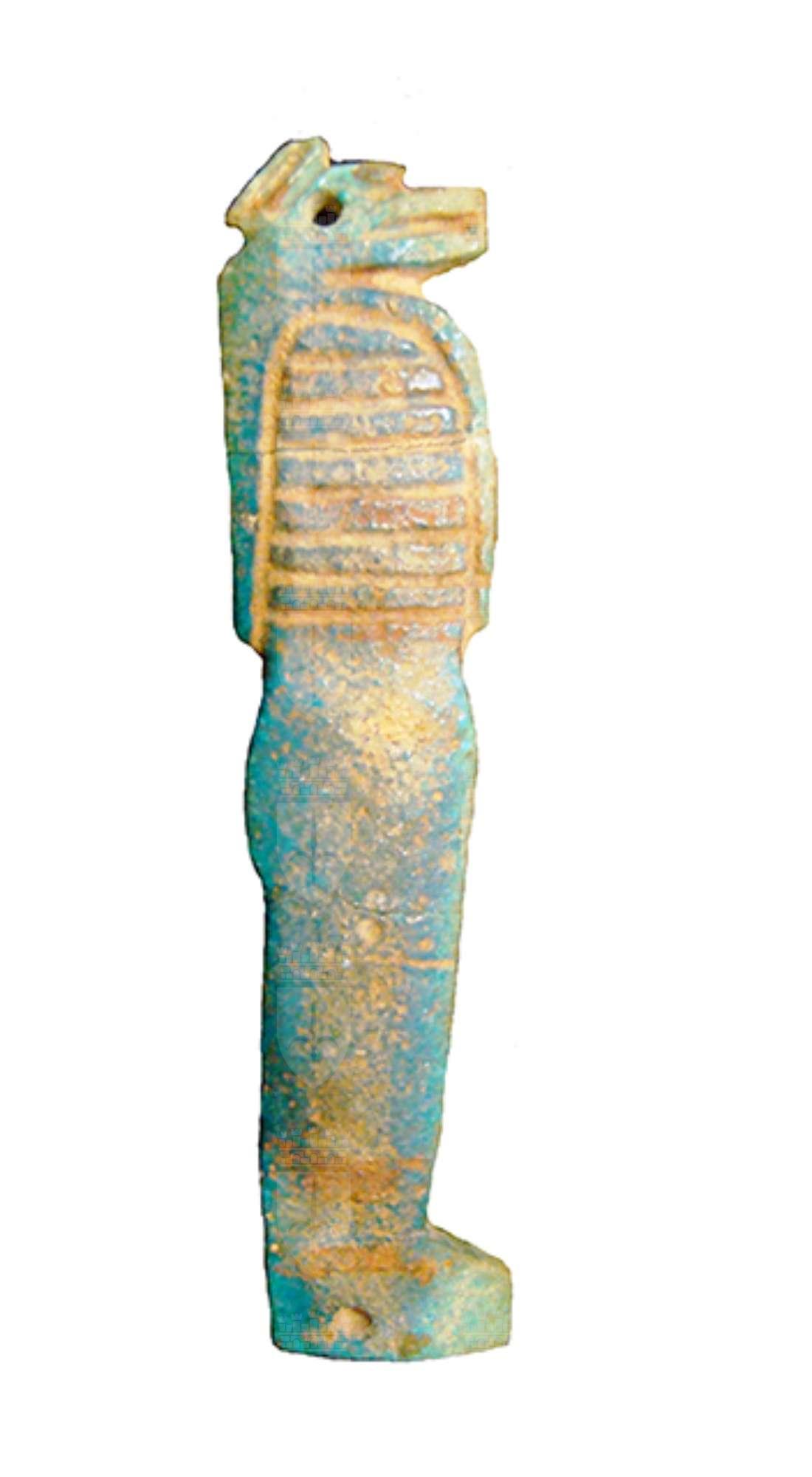 Amuleto in faience, dallo spessore così ridotto da risultare quasi una piastrina, che veniva cucito sulle bende delle mummie. Raffgura il profilo del corpo mummiforme del genio funerario Hapi, caratterizzato da una testa di babbuino, attraverso la quale vi è il foro per il fissaggio alle bende, mentre il secondo foro è visibile nella zona dei piedi.