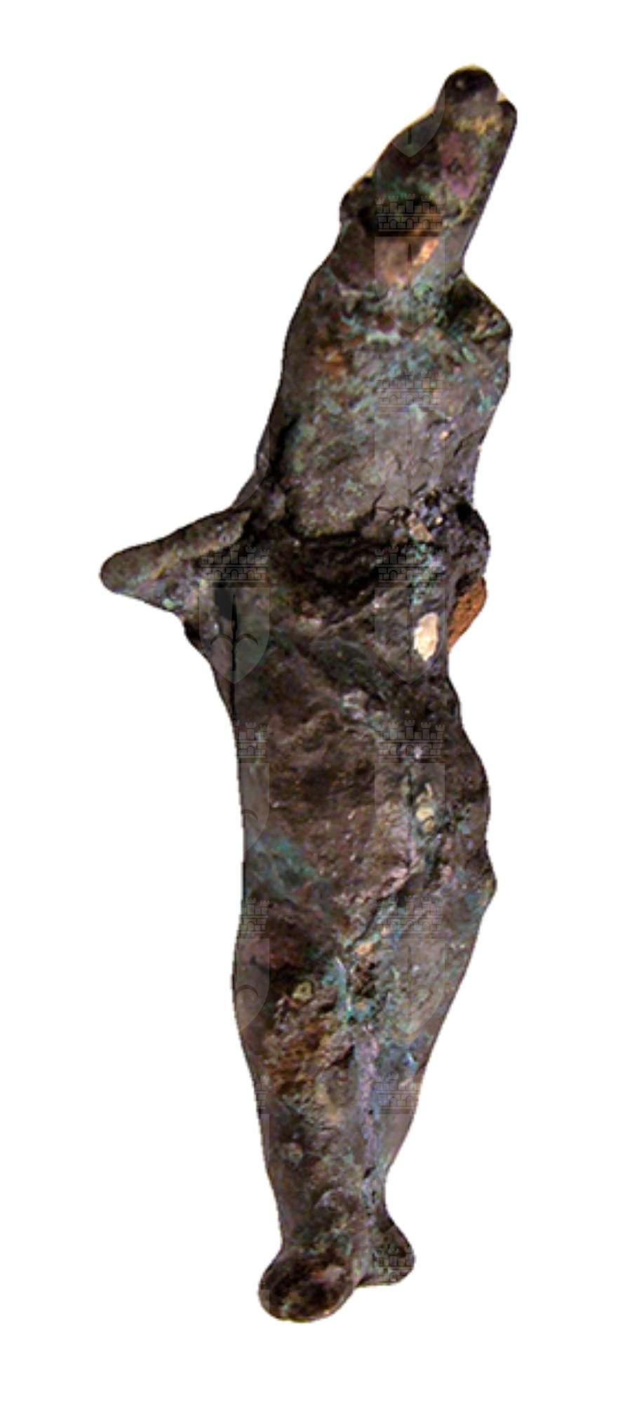 Amuleto in bronzo raffigurante il dio Arpocrate: il dio fanciullo è ritratto nudo, semidisteso. L'anatomia grassoccia lo associa alle raffigurazioni degli eroti di epoca ellenistica. I tratti iconografici che lo contraddistinguono si vedono a malapena, dato il cattivo stato di conservazione della superficie: la treccia infantile che scende sul lato destro del capo e il braccio destro piegato per portare l’indice alla bocca. Sul capo porta la corona doppia dell'Alto e Basso Egitto. Arpocrate è una divinità bambina il cui culto avrà molta fortuna nelle epoche finali della storia egiziana, ed è considerato figlio di Iside ed Osiride.