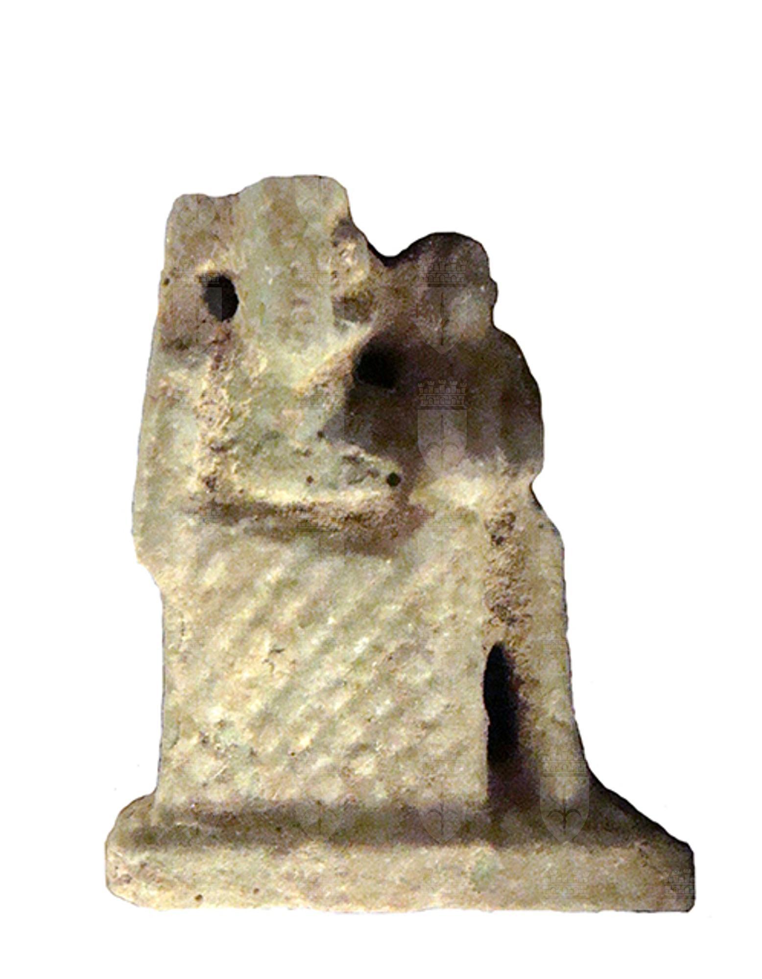 Amuleto in faience raffigurante Iside seduta su un trono a basso schienale, raffigurata nell’atto di allattare il figlioletto Horus, disteso sulle sue ginocchia. I piedi poggiano su una piccola base ed è presente un foro all'altezza della schiena. Purtroppo la testa della dea è spezzata.