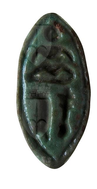 Anello in faience azzurra con castone di forma oblunga con incisione di segni geroglifici, probabilmente recanti una formula augurale.