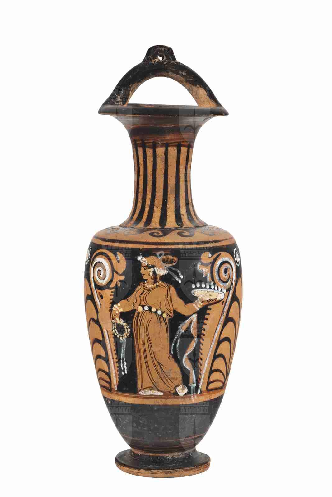Il corpo del vaso è ovoide e allungato verso il basso, poggia su un piede a disco semplice grazie a un cortissimo stelo. Il collo, distinto da un listello, è lungo e cilindrico, con profilo concavo e orlo estroflesso. L'ansa sopraelevata presenta un foro per la sospensione. La vernice nera, opaca, risparmia l'interno dell'ansa a staffa e il bordo esterno del piede e copre completamente l'orlo, la parte superiore del collo e la parte bassa del corpo del vaso; sotto il labbro e sulla parte bassa del corpo del vaso risulta diluita. Molti dettagli sono resi con sovradipinture bianche. Una linea nera, il cui colore è diluito, segna il piano di appoggio della composizione principale. Il colore dell'argilla è Munsell 5YR 7/6 (reddish yellow). Sul lato A è rappresentata una fanciulla stante, incedente verso sinistra, con il volto di profilo e il busto di tre quarti; porta il peso sulla gamba destra, mentre la sinistra è leggermente flessa. I capelli ricciuti sono raccolti in uno chignon con un sakkos e un nastro bianco annodato a fiocco, con un ciuffo che sfugge e scende fino al collo. La figura è riccamente ingioiellata con una ghirlanda sul capo, orecchini con pendenti, collana di perle e bracciali, tutti resi in bianco. Indossa un lungo chitone pieghettato, che lascia intravedere la gamba sinistra, retto da un cinturone ornato, reso in nero con sovradipinture bianche; bianchi sono anche i piedi, probabilmente a rappresentare delle calzature. Con la mano destra regge un serto con un nastro pendente, con la sinistra, protesa all'indietro, una patera con offerte: tutti gli attributi sono resi in bianco. Dal polso sinistro sembra inoltre pendere una tenia, decorata con un orlo bianco. Sul lato B, una figura femminile ammantata, stante e perfettamente di profilo a sinistra; il volto è molto simile a quello della figura del lato A, con la stessa capigliatura e ornamenti. L'himation, caratterizzato solo da poche pie-ghe, copre completamente le forme del corpo, lasciando scoperti solo i piedi e facendo intuire la posizione del braccio sinistro, flesso all'altezza della vita. Le calzature sono ben caratterizzate, con dettagli in nero e in bianco. La composizione è completata da un elemento vegetale a spiga a sinistra della figura ammantata. Come motivi accessori, il collo è ornato da una baccellatura, mentre sulla spalla troviamo un motivo a onde mari-ne capovolte sinistrorse, limitato da due linee nere. Ai lati della composizione figurata, limitata in alto e in basso da due filetti risparmiati, si trova un motivo vegetale con una palmetta centrale con due girali fioriti e fogliati ai lati, con sovradipinture bianche. In alto, sopra la palmetta, ai lati della foglia centrale lunga e appuntita, due mo-tivi floreali stilizzati in bianco. Da notare che il braccio sinistro della figura femminile del lato A si sovrappone al gi-rale della decorazione accessoria e la forma a pettine delle foglie laterali. Sul collo, sul lato B, si è conservata una vecchia etichetta recante la data di acquisizione da parte del museo (“12 febbraio 1904”); l'attuale numero di inventario generale è invece scritto sotto al piede.